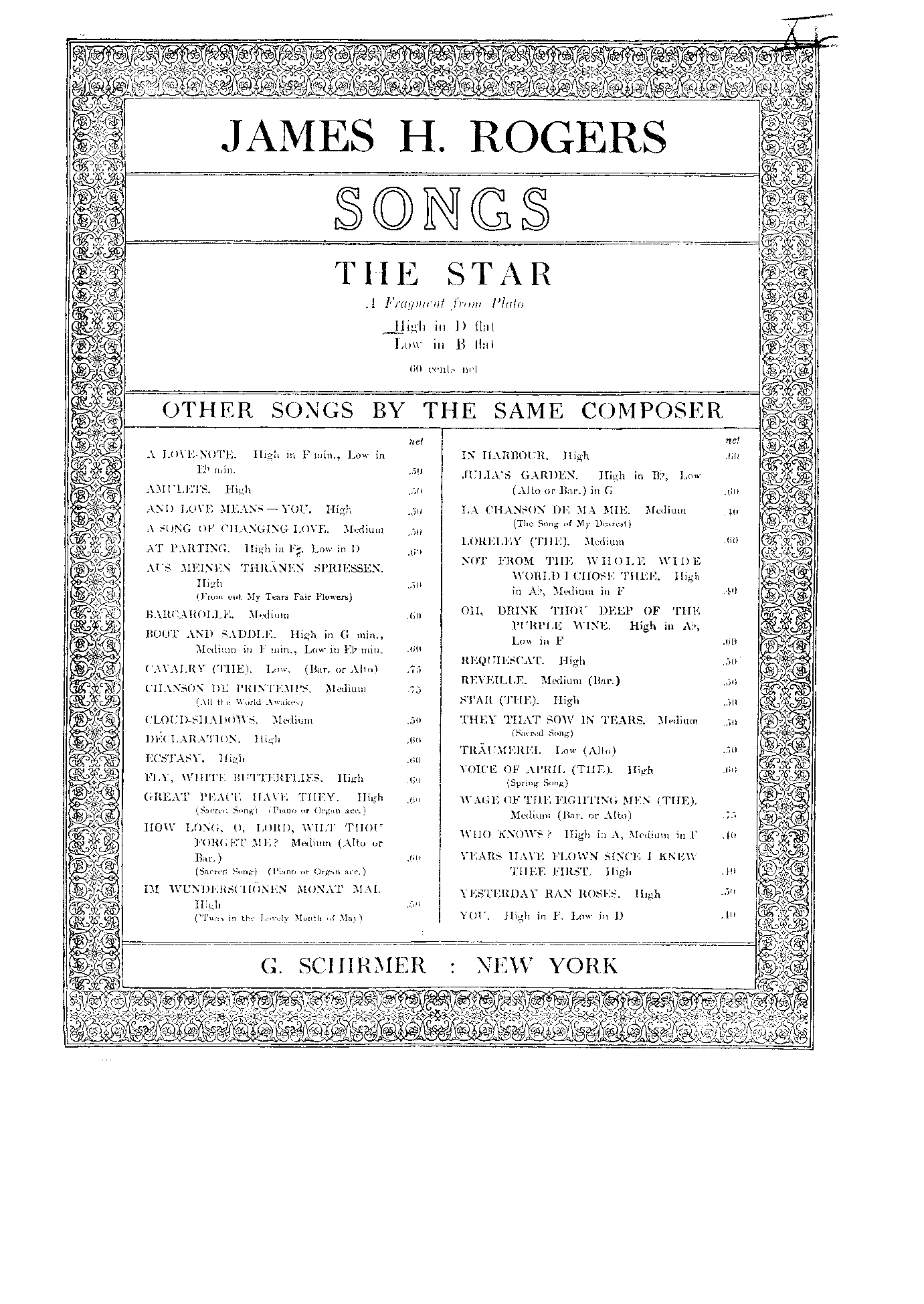 The Library of Congress has pointed out that at least some songs attributed by many to James Hotchkiss Rogers, but which on their cover just say "James H. Rogers", may be by James Henderson Rogers, a contemporary; they have brought in people who know the music of the two composers well to make suggestions as to which belongs to who (the first was better known for his organ music, the latter for his band music, but as to songs, it's a question...) - Schissel