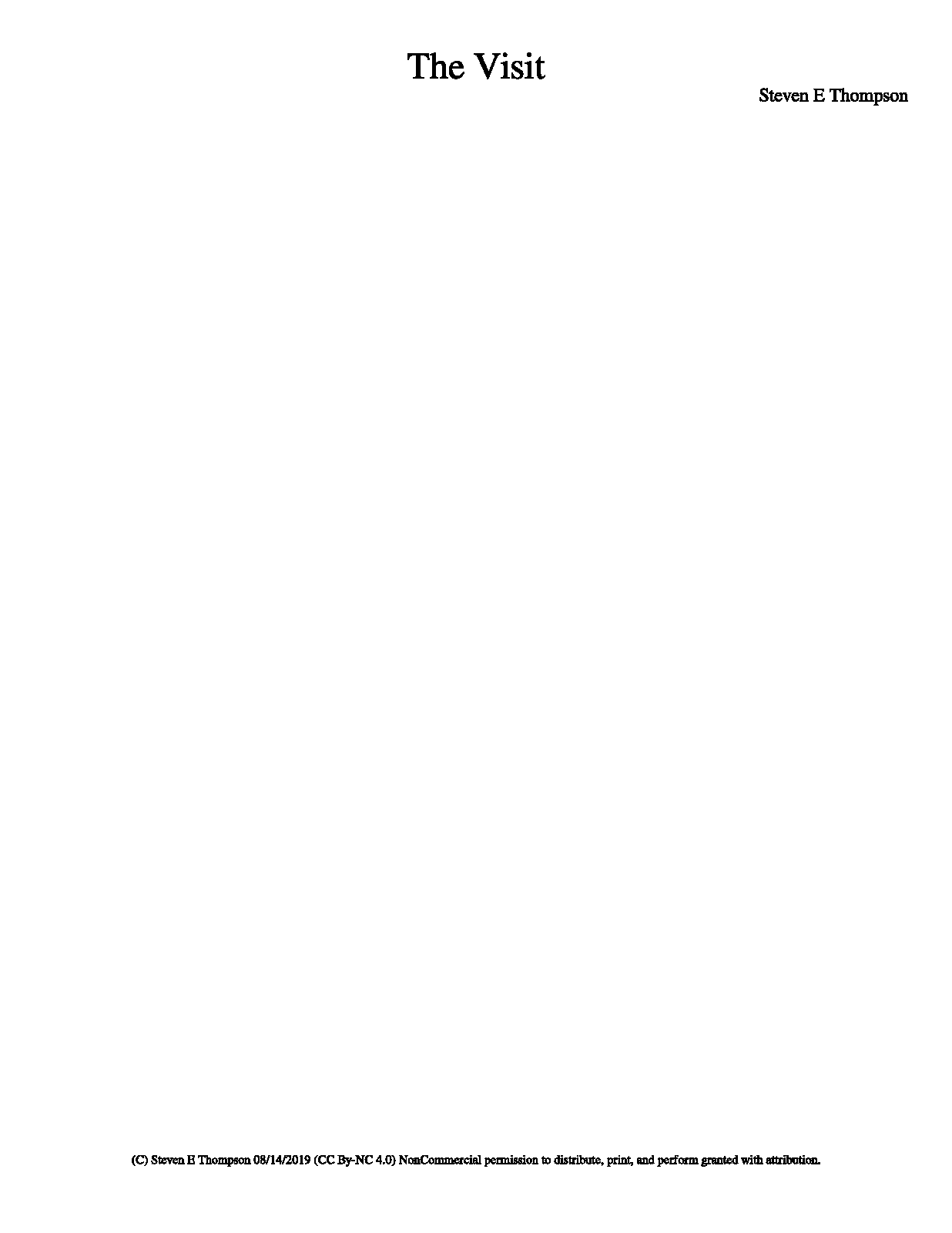 The Visit (contrary to the alien invasion CD cover photo) is just a simple story (in 5 movements) of a day spent visiting family or friends. The piece was written and orchestrated for small orchestra from March to August 2019 by Steven E Thompson. Score parts, and MP3 renditions are available on the IMSLP web site (Composer: Steven E Thompson) for free Non Commercial use (printing, performing, and distributing).