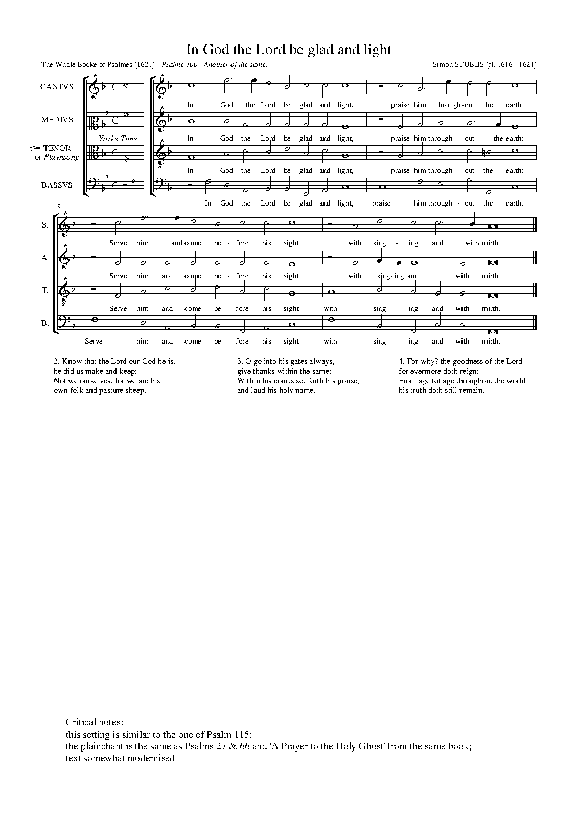 ⇒ 96 more: Kirbye: Lord in thy wrath reprove me not (Psalm 6) • Harrison: O Lord my God I put my trust (Psalm 7) • O God our Lord how wonderful (Psalm 8) • With heart and mouth (Psalm 9) • Tomkins: What is the cause (Psalm 10) • I Trust in God (Psalm 11) • Blankes: Help Lord for good and godly men (Psalm 12) • Tomkins: How long wilt thou forget me Lord (Psalm 13) • Morley: There is no God as foolish men (Psalm 14) • O Lord within thy tabernacle (Psalm 15) • Lord keep me, for I trust in thee (Psalm 16) • O Lord give ear to my just cause (Psalm 17) • Cobbold: O God my strength and fortitude (Psalm 18) • The heavens and the firmament (Psalm 19) • Cranford: In trouble and adversity (Psalm 20) • Bennet: O Lord how joyful is the king (Psalm 21) • O God my God, wherefor dost thou forsake me (Psalm 22) • My Shepherd is the Living Lord (Psalm 23) • Allison: The Earth is all the Lords (Psalm 24) • Ward: I Lift My Heart to Thee (Psalm 25) • Lord be My Judge (Psalm 26) • John Milton Sr.: The Lord is Both My Health and Light (Psalm 27) • Thou art O Lord my strength (Psalm 28) • Give to the Lord Ye Potentates (Psalm 29) • All Laud and Praise with Heart and Voice (Psalm 30) • Bennet: O Lord I put My Trust in Thee (Psalm 31) • The Man is Blest Whose Wickednesse (Psalm 32) • Yee Righteous in the Lord Reioyce (Psalm 33) • I Will Give Laud and Honour (Psalm 34) • Tomkins: Lord Plead My Cause against My Foes (Psalm 35) • The Wicked with His Works Unjust (Psalm 36) • Grudge Not to See the Wicked Men (Psalm 37) • Morley: Put Me Not to Rebuke O Lord (Psalm 38) • Stubbs: I Said I Will Looke to My Wayes (Psalm 39) • I Waited Long and Sought the Lord (Psalm 40) • Blankes: The Man is Blest, that Carefull Is (Psalm 41) • Like as the Hart doth Breath and Bray (Psalm 42) • Judge and revenge my cause O Lord (Psalm 43) • Blankes: Our eares haue heard our fathers tell (Psalm 44) • My heart doth take in hand (Psalm 45) • Thomas Morley: The Lord is our defence and aid (Psalm 46) • Tomkins: Ye people all with one accord (Psalm 47) • Tomkins: Great is the Lord (Psalm 48) • All people harken and give ear (Psalm 49) • Blankes: The Mighty God th'Eternall hat thus spoke (Psalm 50) • Peerson: The God of Gods, the Lord (Psalm 50 b) • O Lord, Consider My Distress (Psalm 51) • Cranford: Have Mercy on Me God (Psalm 51 b) • Why dost Thou Tyrant Boast Abroad (Psalm 52) • The Foolish Man (Psalm 53) • God Save Mee for Thy Holy Name (Psalm 54) • John Milton Sr.: O God give ear (Psalm 55) • Harrison: Have mercy Lord on mee (Psalm 56) • Take pittie for thy promise sake (Psalm 57) • Farmer: Ye Rulers which are put in trust (Psalm 58) • Send ayde and save me (Psalm 59) • Blankes: O Lord thou didst us cleane forsake (Psalm 60) • Allison: Regard (O Lord) for I complaine (Psalm 61) • My soule to God shall give good heed (Psalm 62) • O God my God I watch betime (Psalm 63) • O Lord unto my voyce give eare (Psalm 64) • Thy Praise Alone (O Lord) doth Raigne (Psalm 65) • John Milton Sr.: Yee men on earth in God reioyce (Psalm 66) • Have mercy on us Lord (Psalm 67) • Allison: Let God arise (Psalm 68) • Allison: Save me O God (Psalm 69) • Peerson: O God to me take heed (Psalm 70) • My Lord my God in all distresse image (Psalm 71) • Lord give thy judgements to the King (Psalm 72) • How ever it be (Psalm 73) • Why art thou Lord so long from us (Psalm 74) • Stubbs: Unto thee God will we give thanks (Psalm 75) • To all that now in lury dwell (Psalm 76) • Allison: With my voyce to God doe cry (Psalm 77) • Cavendish: Attend my people to my Law (Psalm 78) • O Lord the Gentiles doe inuade (Psalm 79) • Bennet: Thou heard that Israel dost keepe (Psalm 80) • Allison: Be light and glad in God reioyce (Psalm 81) • Allison: Amid the prease with men of might (Psalm 82) • Doe not O God refraine thy tongue (Psalm 83) • How pleasant is thy dwelling place (Psalm 84) • Thou hast been mercifull indeed (Psalm 85) • Lord bow thine eare (Psalm 86) • That Citie shall full well endure (Psalm 87) • Lord God of health (Psalm 88) • Tomkins: To Sing the Mercies of the Lord (Psalm 89) • Thou Lord hast Beene our Sure Defence (Psalm 90) • Hee that within the secret place (Psalm 91) • Stubbs: It is a Thing both Good and Meet (Psalm 92) • The Lord as King Aloft doth Raigne (Psalm 93) • O Lord Thou dost Reuenge All Wrong (Psalm 94) • Come, let us lift up our voyce sound - Venite exultemus (Psalm 95) • Sing Ye with Praise unto the Lord (Psalm 96) • Tomkins: The Lord doth Raigne Whereat the Earth (Psalm 97) • O Sing Yee Now unto the Lord (Psalm 98) • Stubbs: The Lord doth Raigne (Psalm 99)