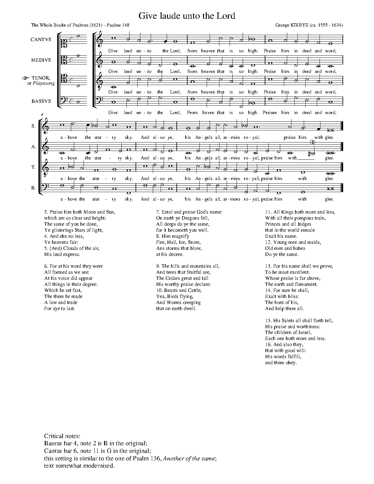 ⇒ 48 more: I mercy will and iudgement sing (Psalm 101) • John Milton Sr.: O Heare my Prayer Lord (Psalm 102) • Johnson: My soule give laud unto the Lord (Psalm 103) • My soule praise the Lord (Psalm 104) • Allison: Give prayses unto God the Lord (Psalm 105) • Praise ye the Lord (Psalm 106) • Give thanks unto the Lord our God (Psalm 107) • O God my heart prepared is (Psalm 108) • In speechless silence doe not hold (Psalm 109) • The Lord did say unto my Lord (Psalm 110) • With heart I doe accord (Psalm 111) • Kirbye: The man is blest that God doth feare (Psalm 112) • Ye Children which doe serve the Lord (Psalm 113) • Blankes: When Israel by Gods addresse (Psalm 114) • Stubbs: Not unto us Lord (Psalm 115) • I Love the Lord, because my voyce (Psalm 116) • O All ye nations of the world Psalm 117) • Stubbs: O Give ye thanks unto the Lord (Psalm 118) • Farnaby: Blessed are they that perfect are (Psalm 119) • In trouble and in thrall (Psalm 120) • Farnaby: I lift mine eyes to Sion hill (Psalm 121) • Farnaby: I did in heart reioyce (Psalm 122) • O Lord that heaven dost possesse (Psalm 123) • Now Israel may say (Psalm 124) • Farnaby: Such as in God the Lord doe trust (Psalm 125) • Allison: Those that doe put their confidence (Psalm 125b) • Johnson: When that the Lord againe his Sion (Psalm 126) • Kirbye: Except the Lord the house doe make (Psalm 127) • Blessed art thou that fearest God (Psalm 128) • Bennet: Oft they, now Israel may say (Psalm 129) • Lord to thee I make my mone (Psalm 130) • O Lord I am not puft in minde (Psalm 131) • Remember Davids troubles Lord (Psalm 132) • O How happy a thing it is (Psalm 133) • Peerson: Behold and have regard (Psalm 134) • Allison: O praise the Lord, praise him (Psalm 135) • Kirbye: Praise ye the Lord, for he is good (Psalm 136) • Kirbye: O laud the Lord benigne (Psalm 136b) • When as we sate in Babylon (Psalm 137) • J. Milton Sr.: Thee will I prayse with my whole heart (Psalm 138) • Allison: O Lord thou hast me tride and knowne (Psalm 139) • Lord save me from the evill man (Psalm 140) • Hooper: O Lord upon thee doe I call (Psalm 141) • Harrison: Before the Lord God with my voyce Psalm 142) • Tomkins: Lord heare my prayer (Psalm 143) • Blest be the Lord (Psalm 144) • Hooper: Thee will I laud my God and King (Psalm 145) • Bennet: My soule praise thou the Lord alwayes (Psalm 146)