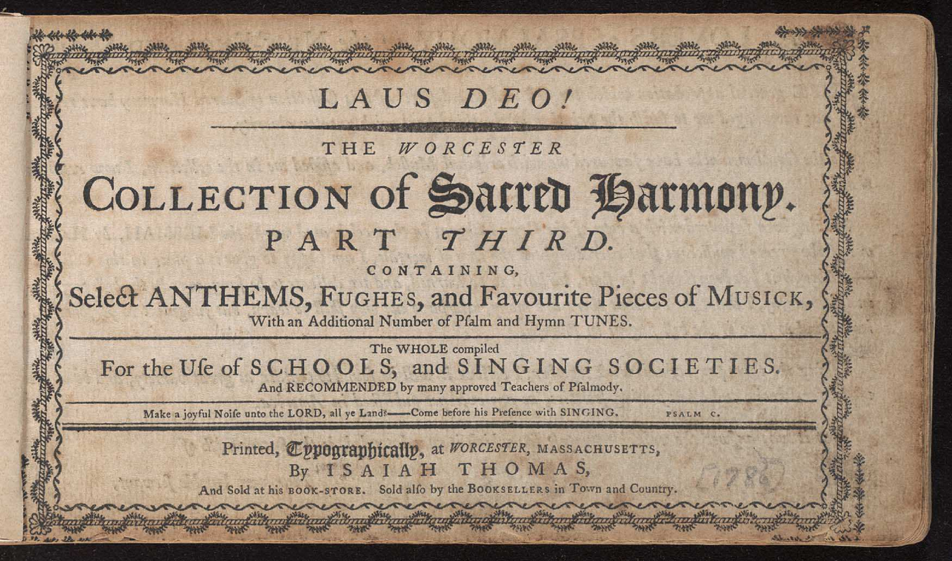Laus Deo! The Worcester Collection of Sacred Harmony. In Three Parts. Containing, I. An Introduction to the Grounds of Musick: or, Rules for Learners. II. A large Number of celebrated Psalm and Hymn Tunes, from the most approved ancient and modern Authors; together with several new ones, never before published: The whole suited to all Metres, usually sung in Churches. III. Select Anthems, Fughes, [sic] and Favourite Pieces of Musick, with an Additional Number of Psalm and Hymn Tunes. The Whole compiled for the Use of Schools and Singing Societies.