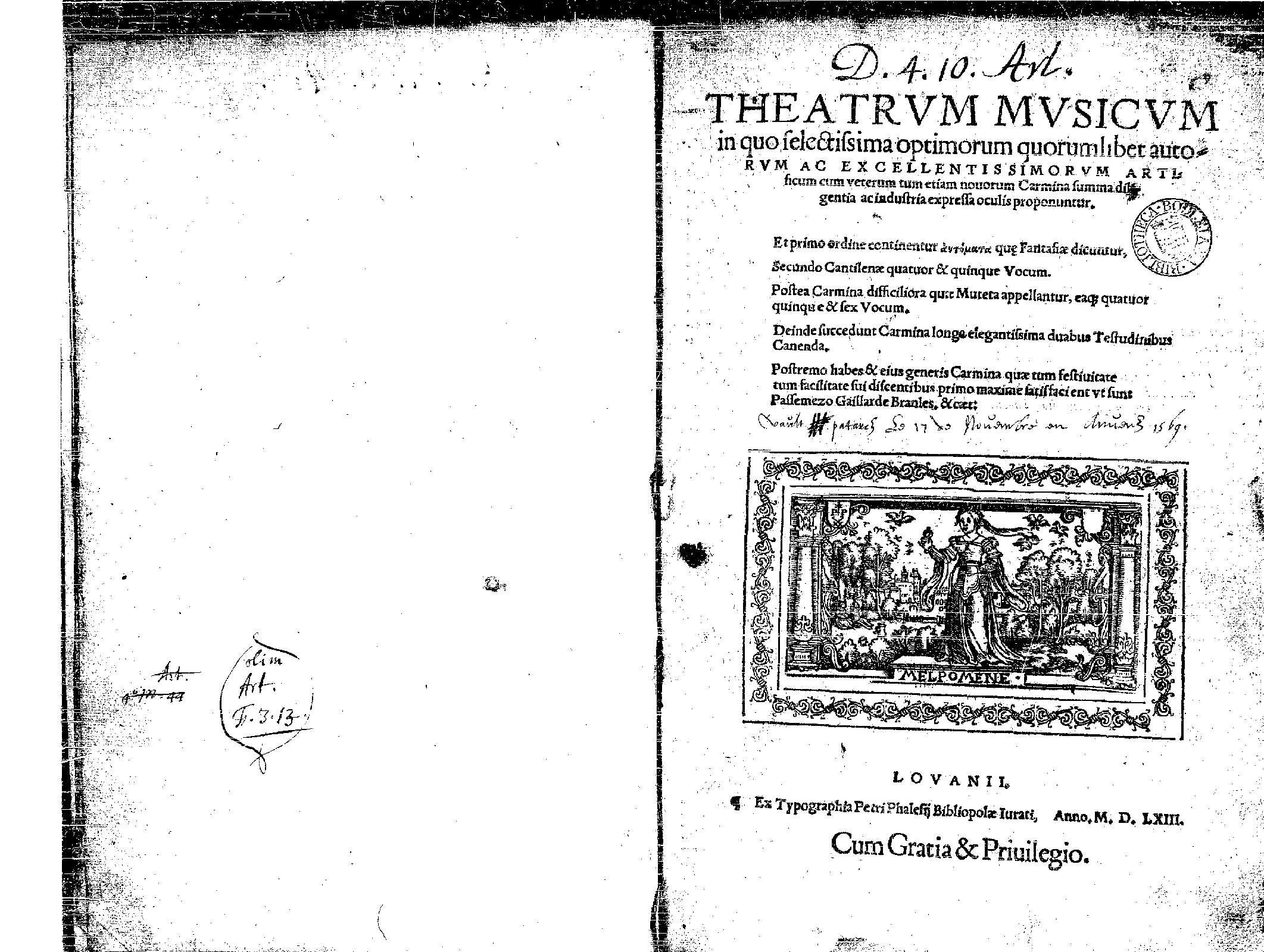 - Theatrvm mvsicvm in quo selectissima optimorum quorum libet autorvm ac excellentissimorvm artificum cum veterum tum etiam nouorum Carmina summa diligentia ac industria expressa oculis proponuntur.
