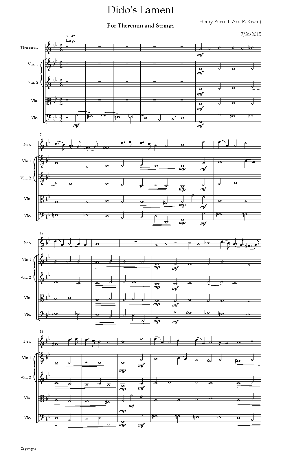 Arrangement for Theremin and Strings. Though notated so that can be played with any keyboard.
