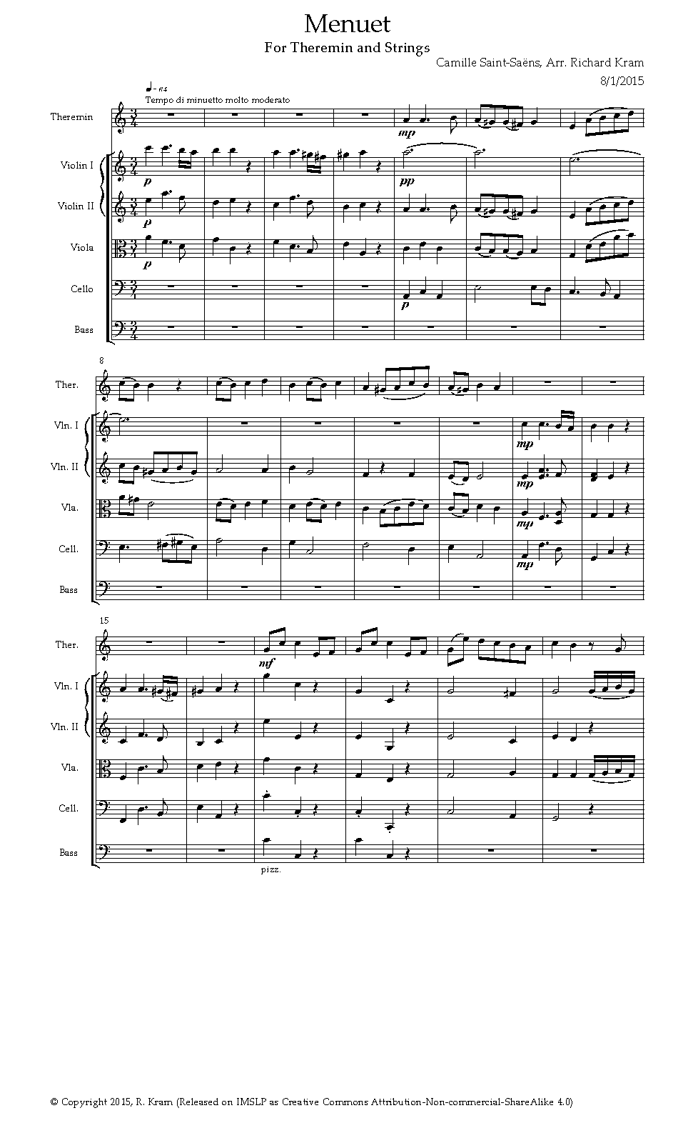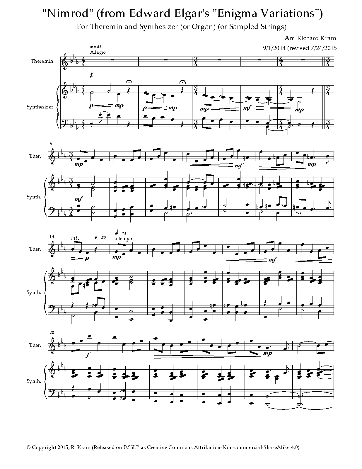 Intended for synthesizer, organ or string samples. Note to admin. Makes sense to put each piece with its own heading like this and keep the part with the score so people can easily get everything for one piece in one place. A number of people from "Theremin World" were interested in this and IMSLP is the best place to do it. For now I'll add them alphabetically by composer. At some point we'll have to decide if its better to put them in tabs by period for easier access. Hopefully this will be a great service to the theremin community.