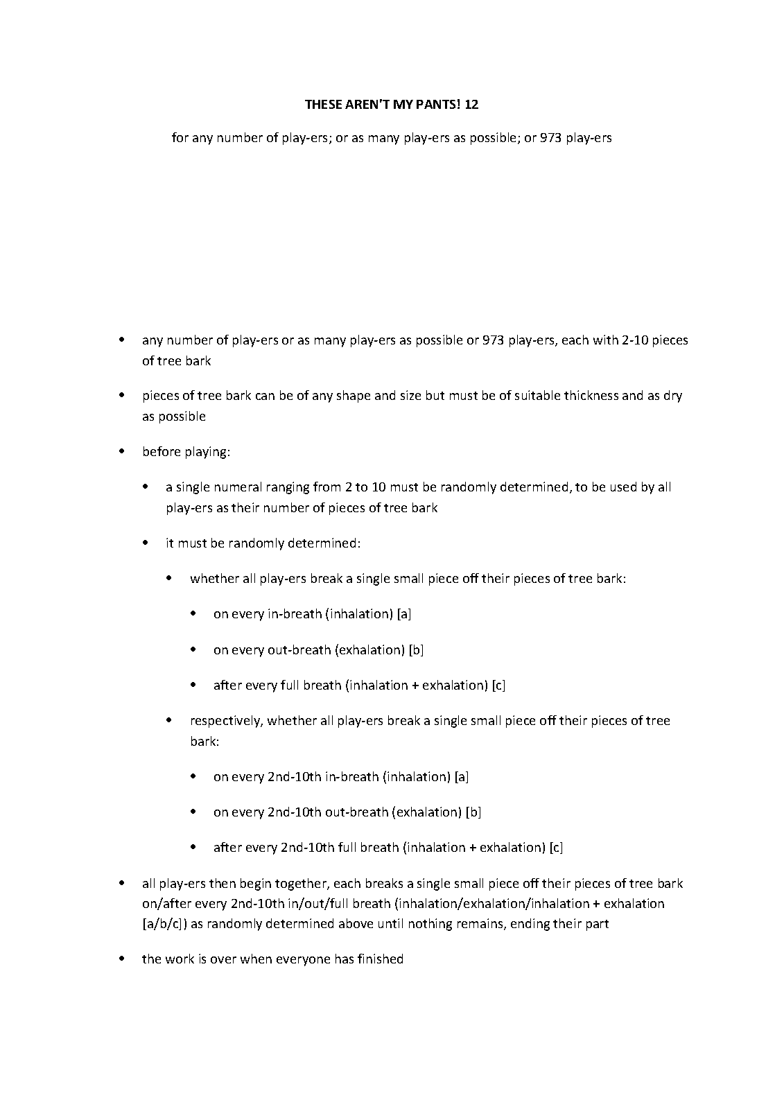 | Instrumentation | any number of play-ers or as many play-ers as possible or 973 play-ers, each with 2-10 pieces of tree bark |