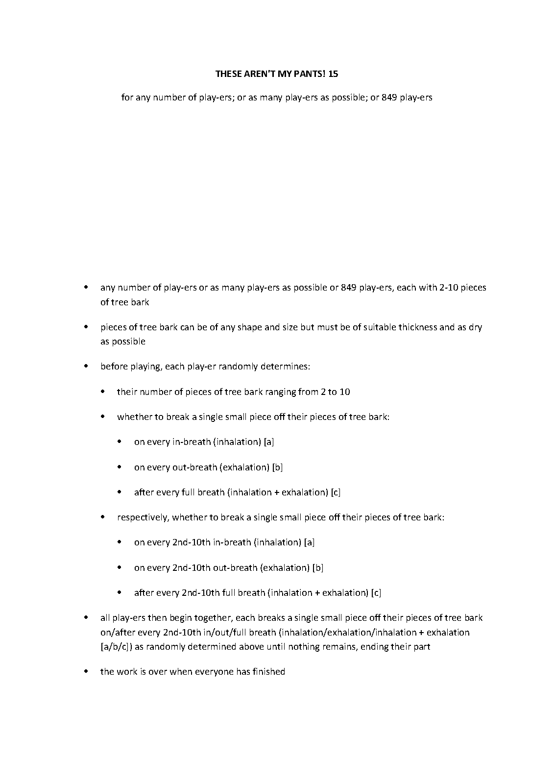 | Instrumentation | any number of play-ers or as many play-ers as possible or 849 play-ers, each with 2-10 pieces of tree bark |