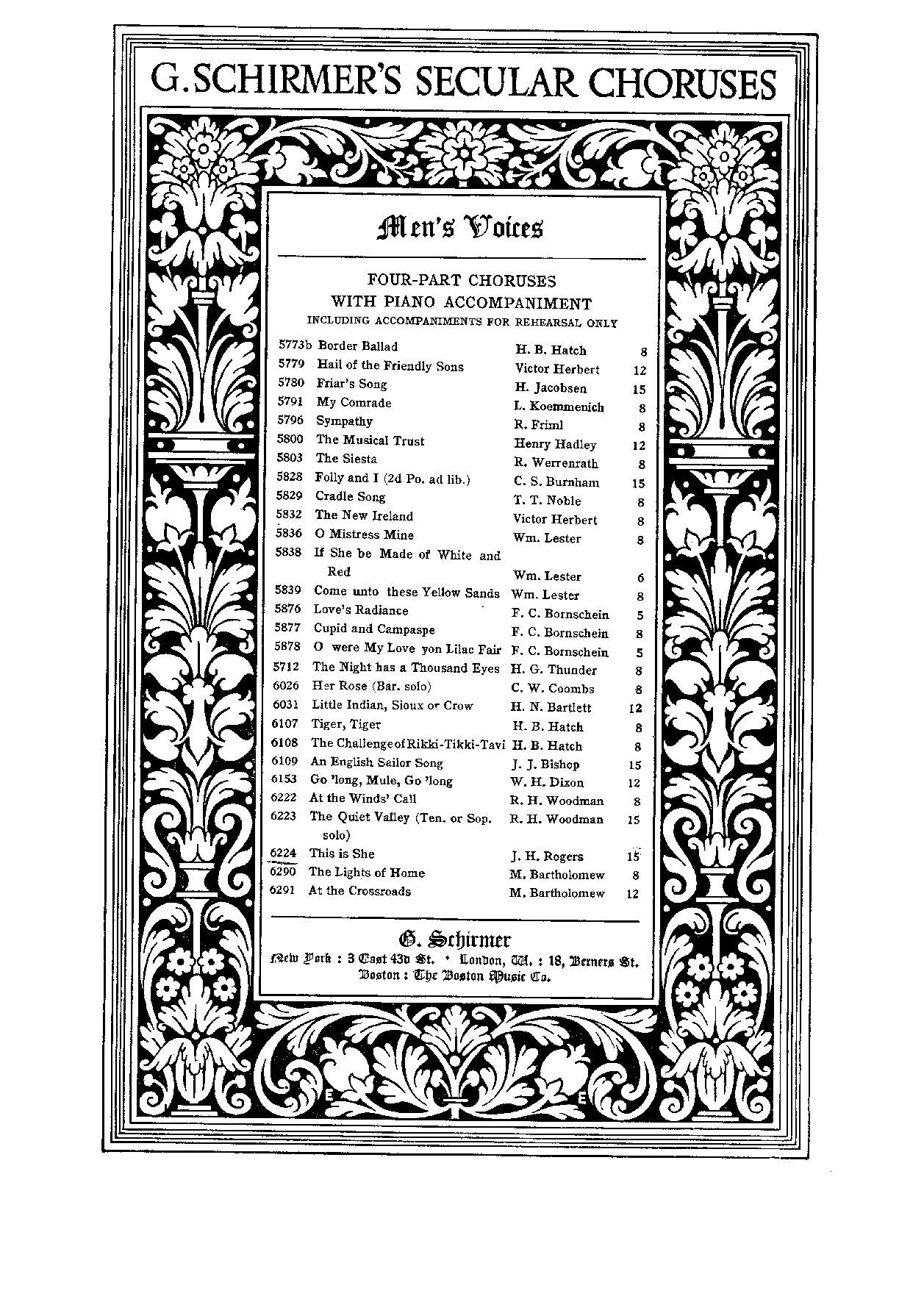 | Genre Categories | Secular choruses; Choruses; For male chorus, piano; |