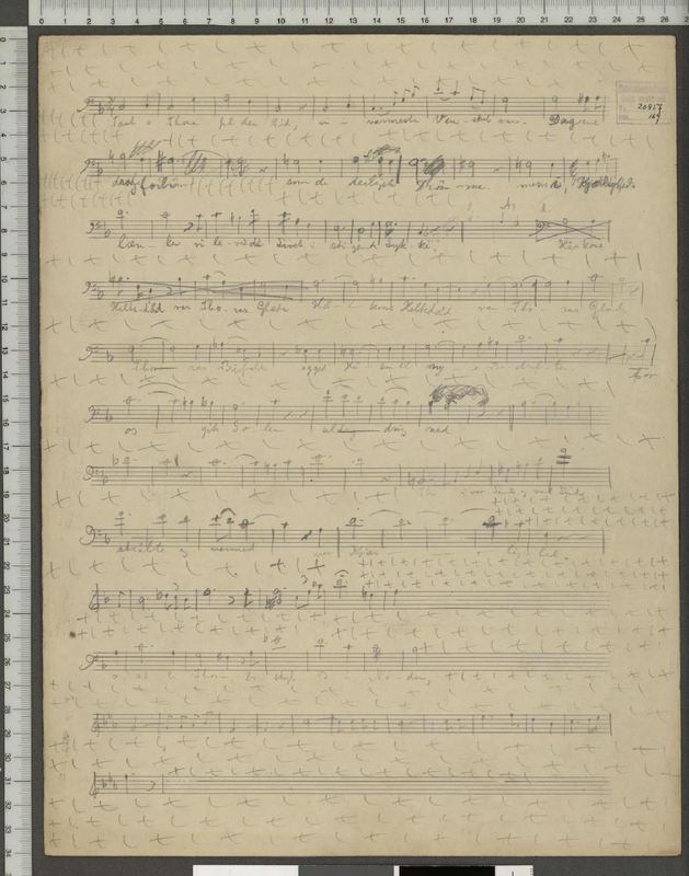 8 upper systems corresponds to Haakon's part on pp.157-163 of Volume 1, system 9 to Thora's part on pp.166-167, system 10 to Kark's part on p.173, system 11-12 to Thora's part on p.194. Backside corresponds to the choir on p. 64 in Volume 2.