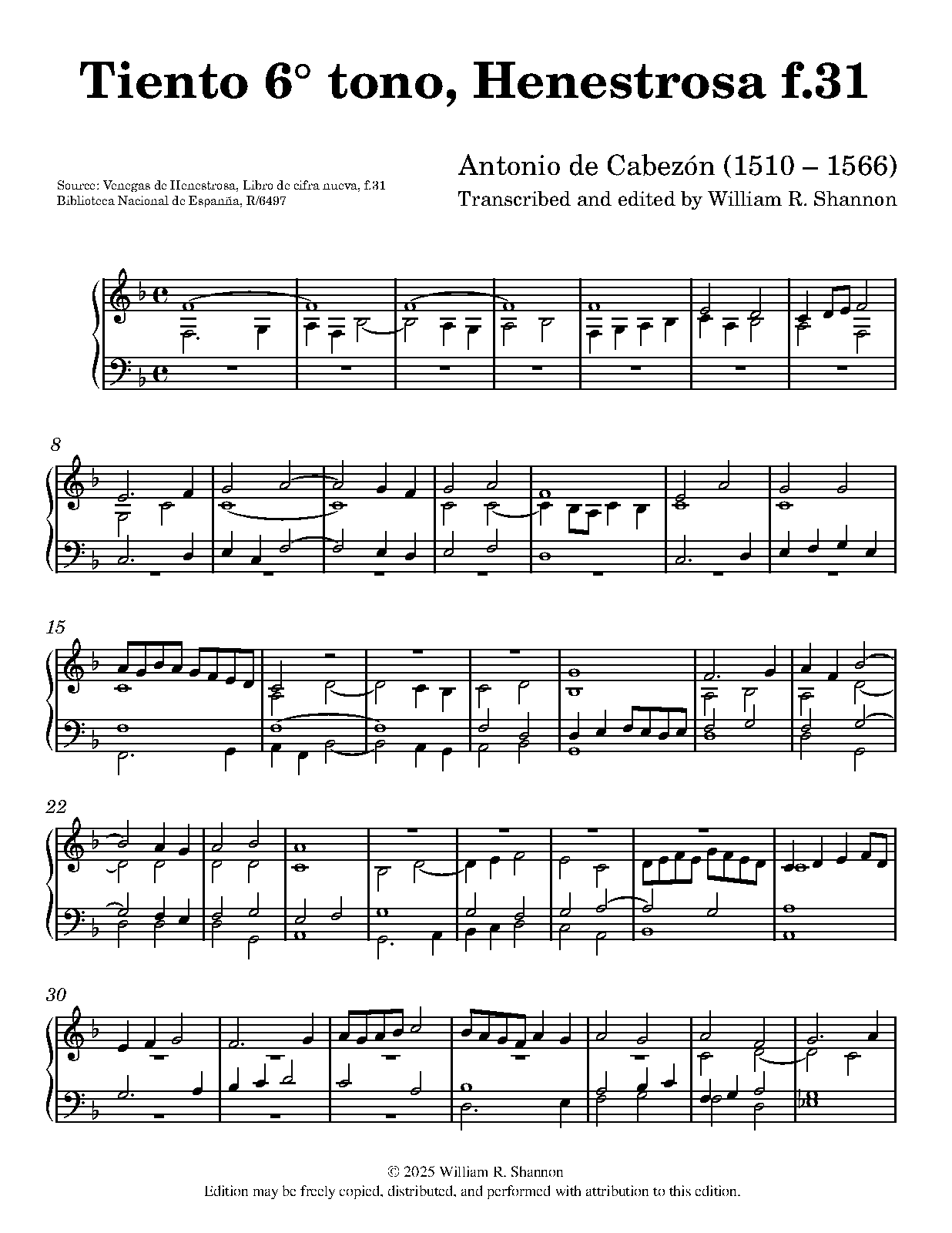 Antonio de Cabezón Tiento 6° tono, Henestrosa f.31, Ronald McKean Organist