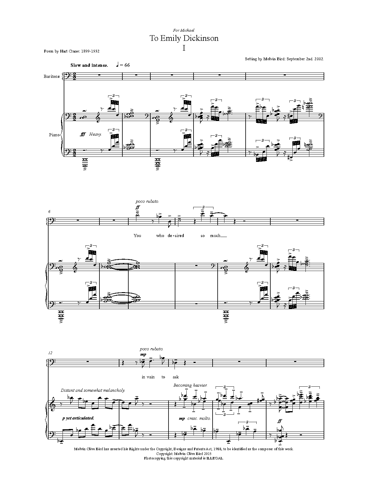 Melvin Bird has asserted his right under the Copyright, Designs and Patents Act, 1988, to be identified as the composer of this work. Please contact the composer for further information. The composer welcomes any performances and recordings. melvin.bird@hotmail.com. A clear and clean text.