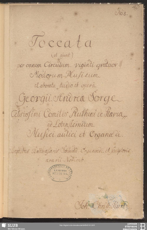 | Alternative. Title | Toccata (ut ajunt) per omnem Circulum viginti qvatuor Modorum Musicum elaborata studio et opera Georgii Andreae Sorge |