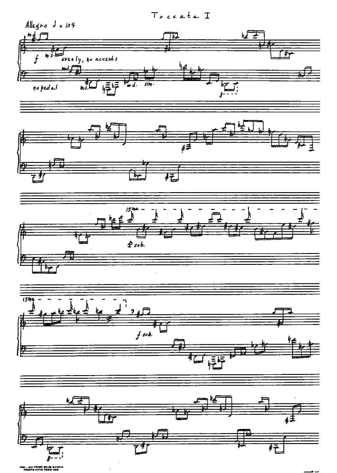 Toccatas and Arias is a culmination of the qualities of balance and symmetry in Fine’s writing—contrasting consonance and dissonance, contrapuntal techniques and homophony, unrelenting drive and lyrical beauty, forte and piano dynamics, and subject and retrograde—the ultimate creation of formal balance and symmetry. Fine achieved in Toccatas and Arias a composer’s ideal goal: to preserve one’s inherent compositional characteristics, to develop one’s style through study, experimentation, and craftsmanship, and to express one’s musical intentions.