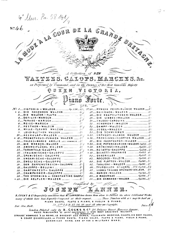 According to Grove Music, all of Lanner's works "were published in Vienna for solo piano; most works also appeared simultaneously in arrangements for orchestra, piano for 4 hands, violin and piano, 3 violins and double bass and for solo flute".