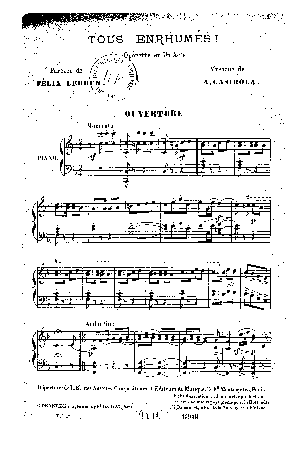 | Copyright Information | Publication noted in the Bibliographie de la France : 87e année, 2e série, Nº 30, 23 Juillet 1898, p.590, reg.3609 (vocal score). |