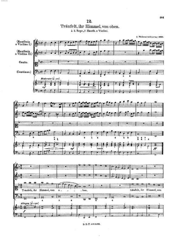 This is actually Johann Rosenmüller's "Treiffet ihr Himmel von oben" (Kern=Sprüche I) published in 1648; Krieger performed lots of music by Rosenmüller in Weißenfels, and it is possible that the editors of DDT mistook it as one of Krieger's own works. 1696 is more likely to have been the year in which the piece was performed there. The instrumental parts are NOT originally for oboes!