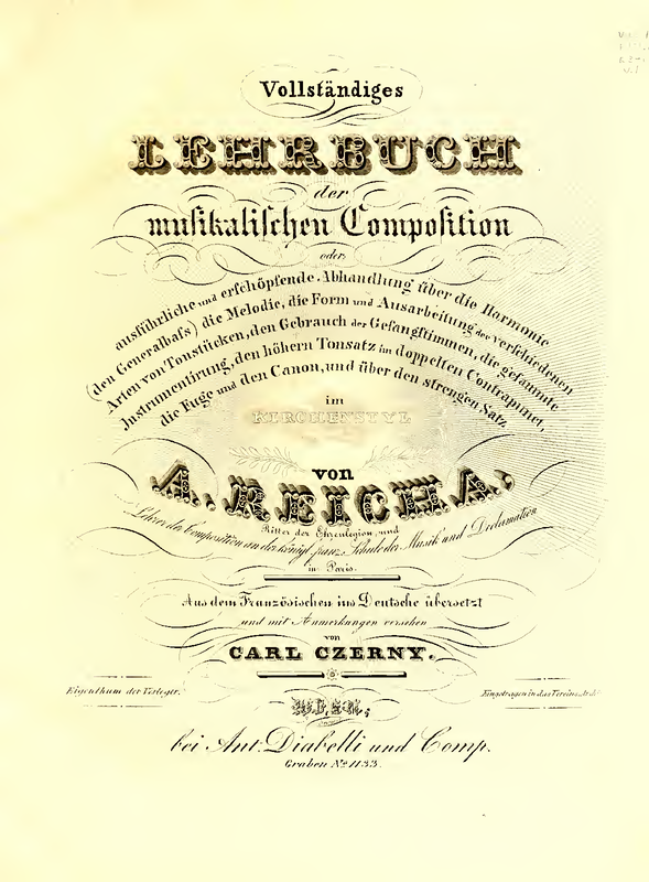 | Alternative. Title | Vollständiges Lehrbuch der musikalischen Composition oder Ausführliche und erschöpfende Abhandlung über die Harmonie, (den Generalbaß), die Melodie, die Form und Ausarbeitung der verschiedenen Arten von Tonstücken, den Gebrauch der Gesangstimmen, die gesammte Instrumentirung, den höhern Tonsatz im doppelten Contrapunct, die Fuge und den Canon, und über den strengen Satz im Kirchenstyl |