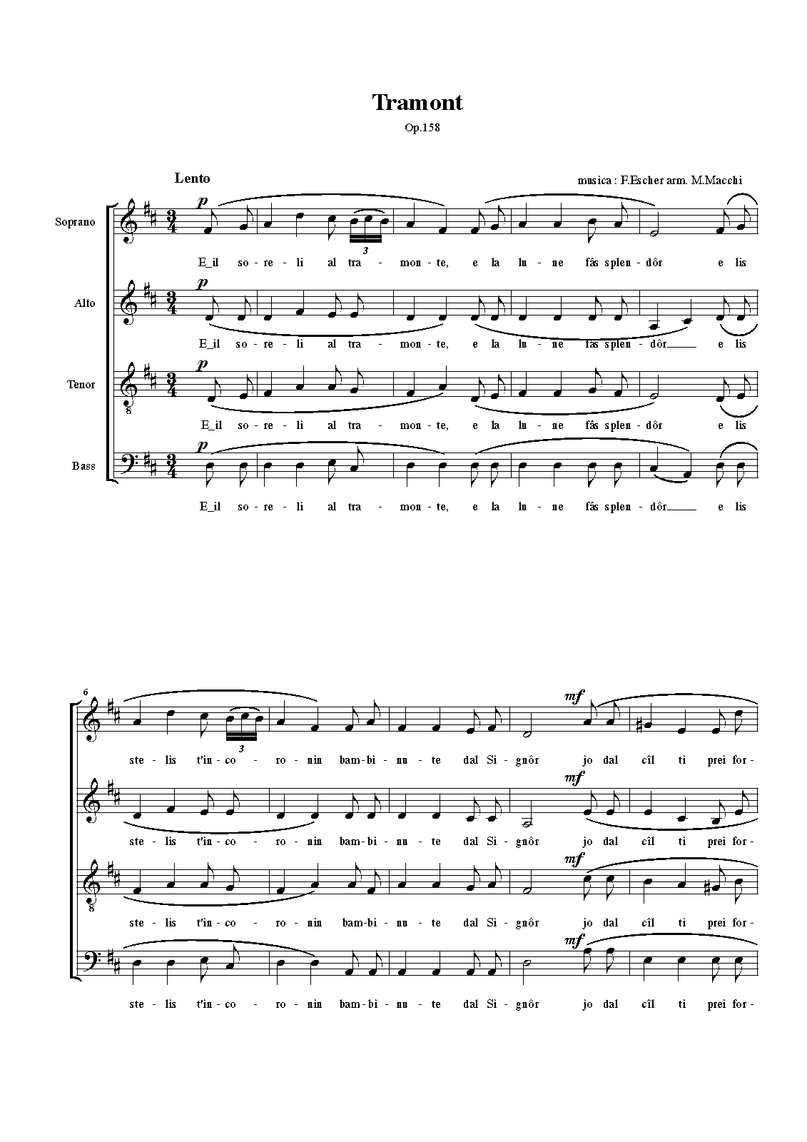 Apart from collecting folk songs, Escher also composed villotte, specifically for choirs, along the lines of popular Friulian songs, so this is likely male chorus rather than solo voices. Mr. Macchi's arrangement says "arm. M. Macchi". It is unclear what the nature of the harmonization is that would be different from Escher's original; perhaps the only difference is that it is for mixed chorus rather than male chorus.