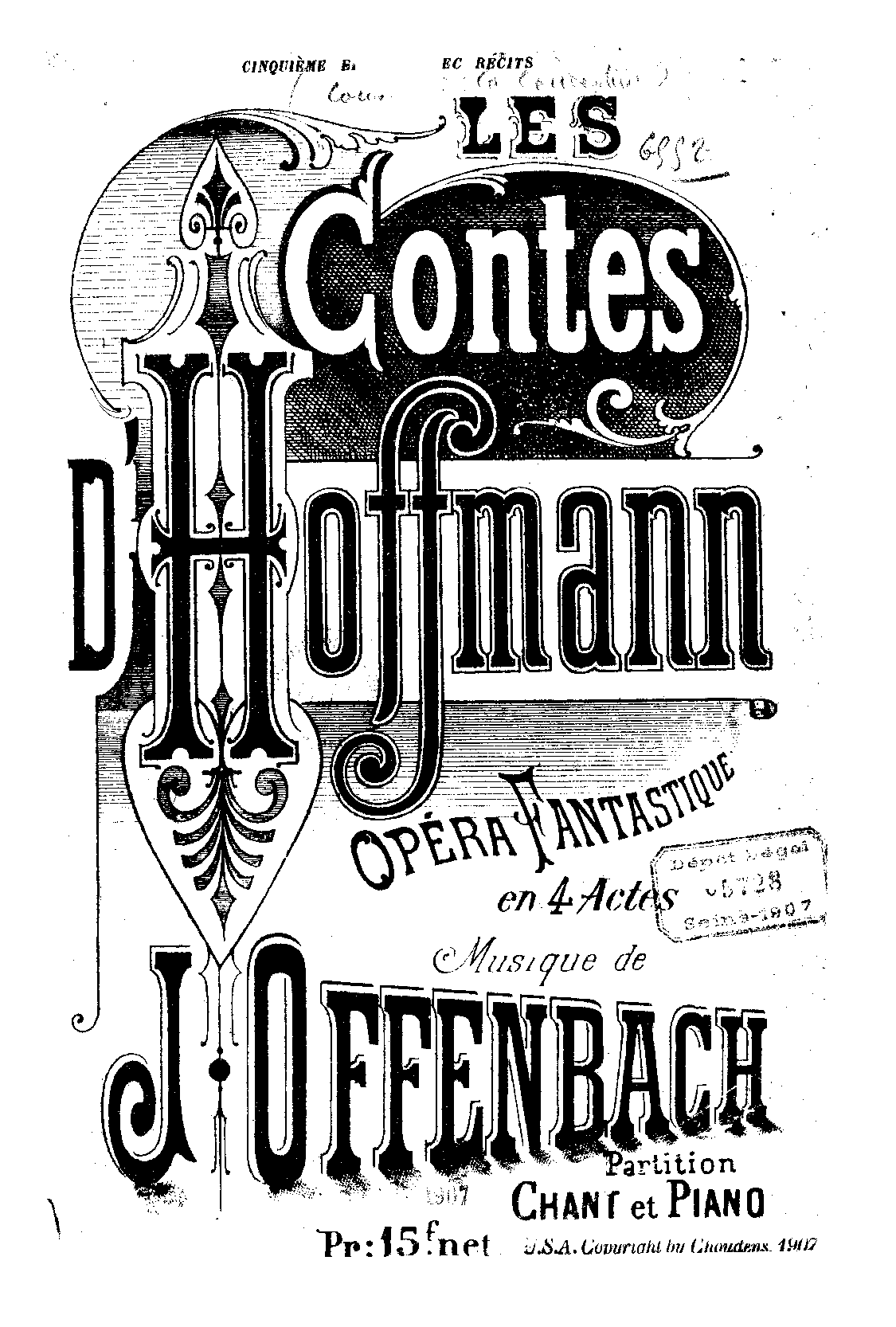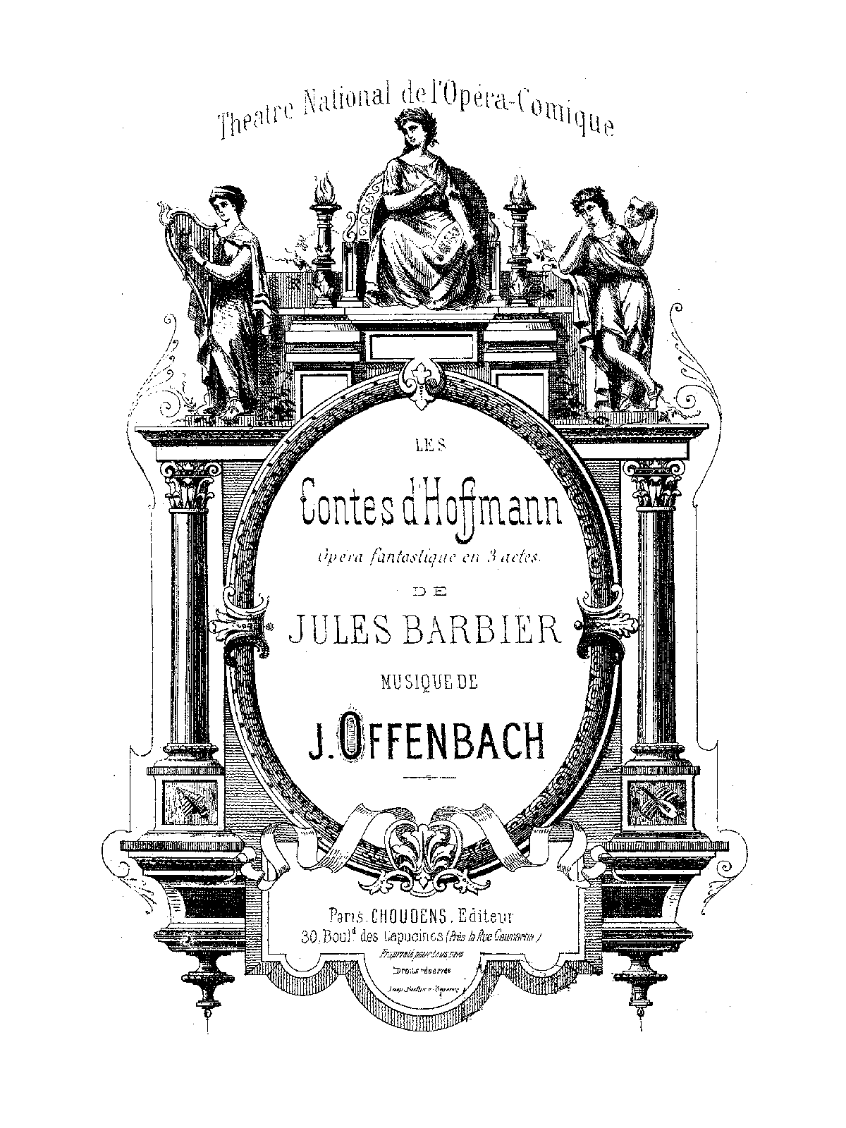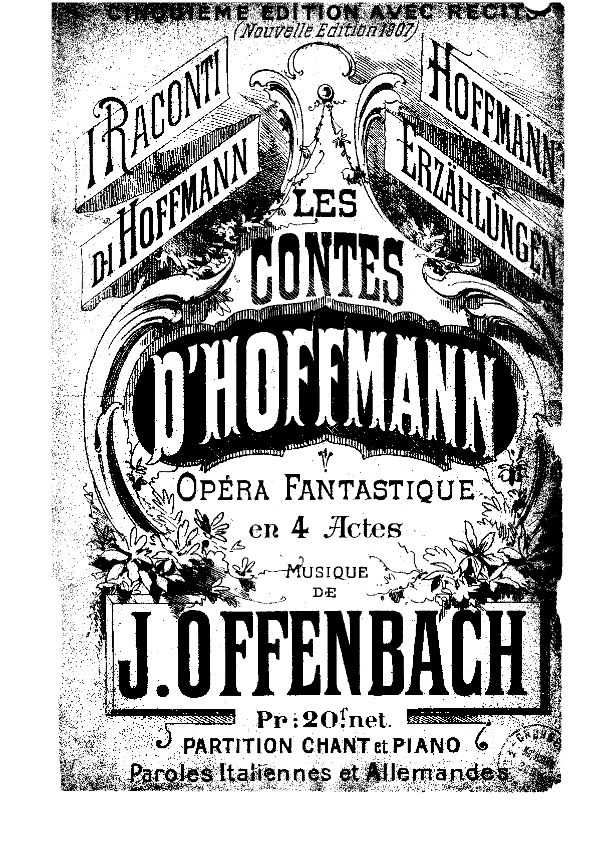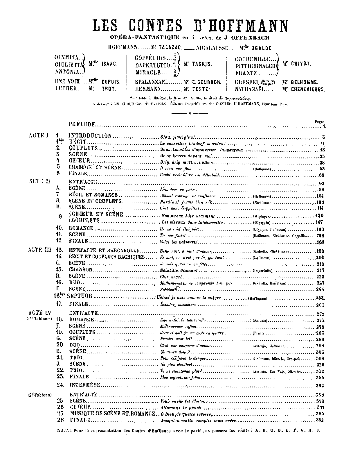 - NOTE: *Originally presented in 4 acts, in a version completed by Ernest Guiraud which omits Act IV and distributes parts of its music to other scenes. The excised content was restored for performances in the early 20th century (published 1907), again constructed in 4 acts (Act V designated Act IV, Scene 2). This version, most common in 20th-century performances, swapped the positions of Act III and Act IV, while restoring recitatives and adding the now-famous chanson 'Scintille diamant' (using music from Le voyage dans la lune) and the septuor (using music of unknown origin with elements of the barcarolle). The section listing above agrees with Offenbach's original intent for the musical order, as does this page's table of contents, yet they do not agree with the majority of scores uploaded here.
