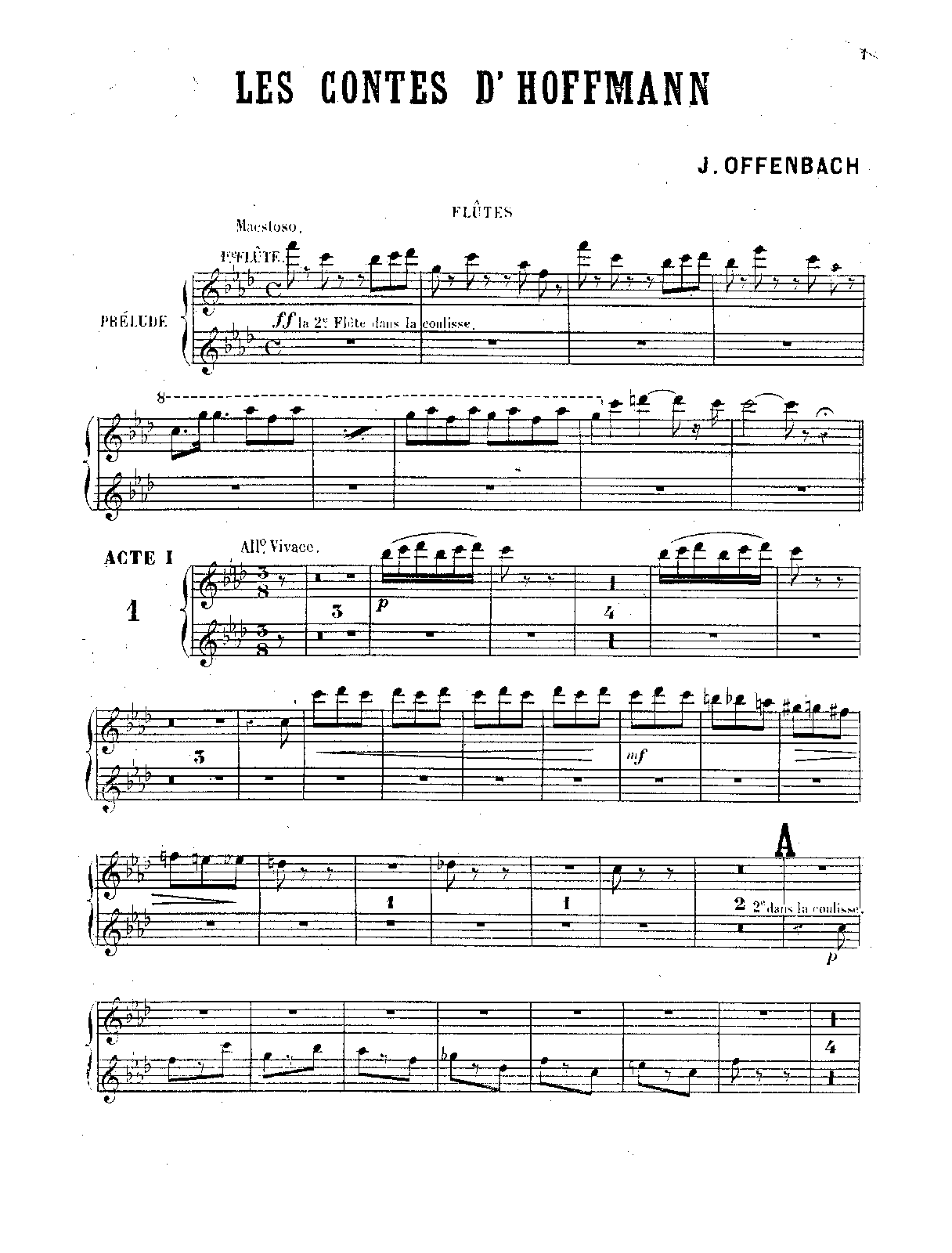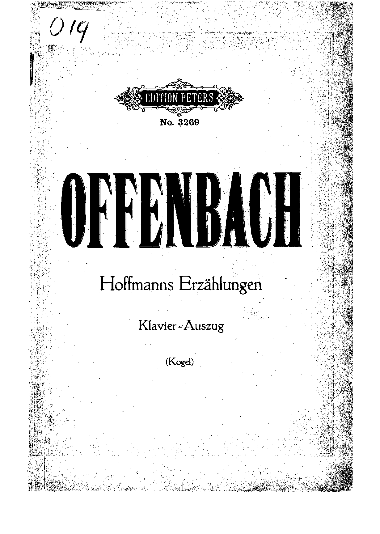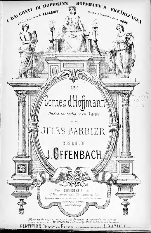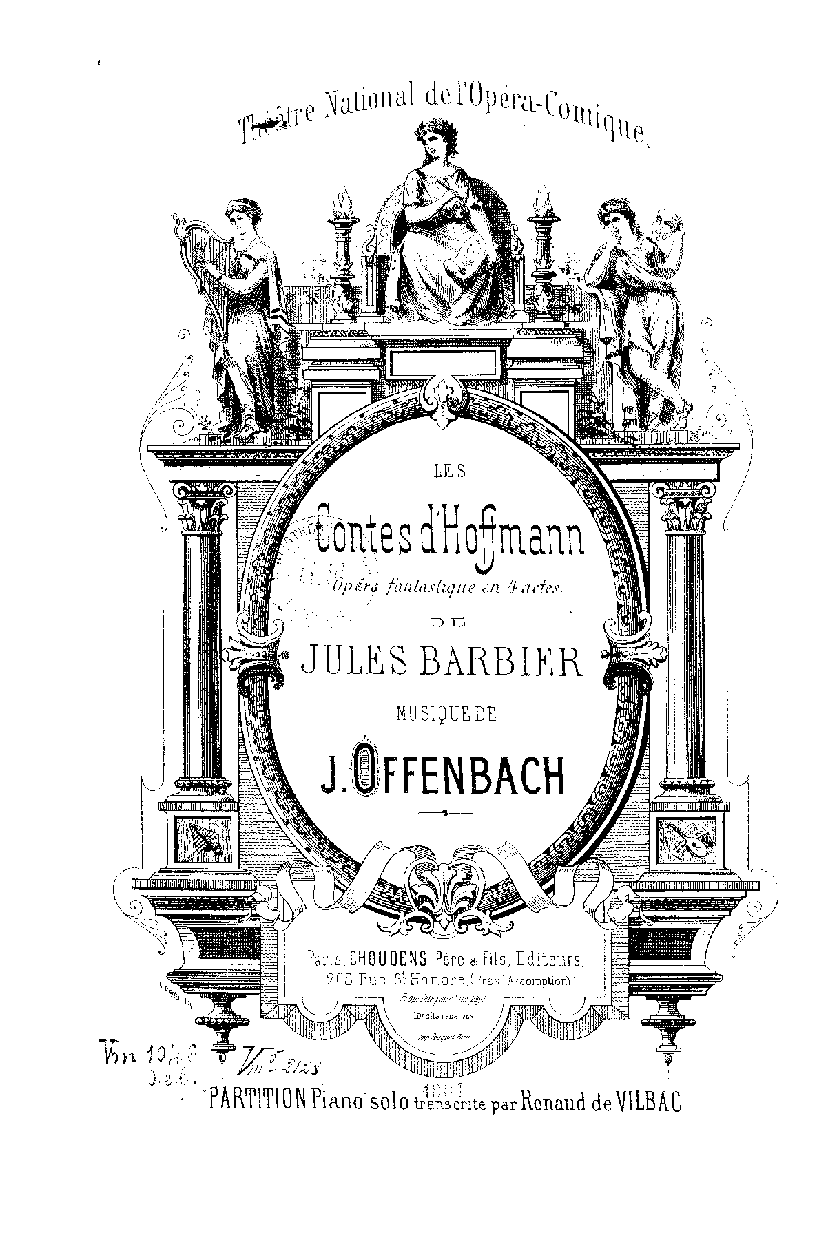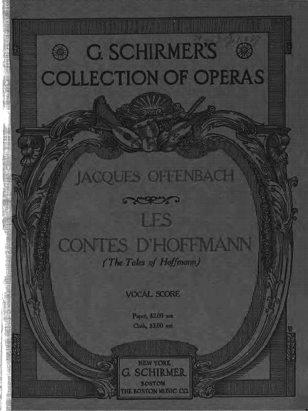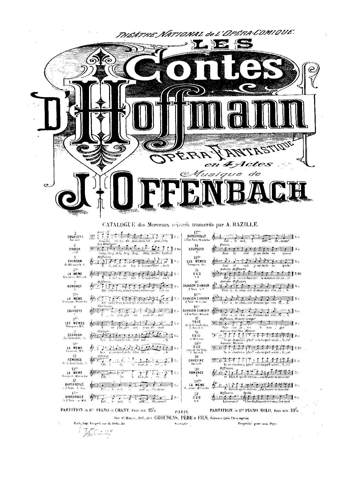 - NOTE: *Originally presented in 4 acts, in a version completed by Ernest Guiraud which omits Act IV and distributes parts of its music to other scenes. The excised content was restored for performances in the early 20th century (published 1907), again constructed in 4 acts (Act V designated Act IV, Scene 2). This version, most common in 20th-century performances, swapped the positions of Act III and Act IV, while restoring recitatives and adding the now-famous chanson 'Scintille diamant' (using music from Le voyage dans la lune) and the septuor (using music of unknown origin with elements of the barcarolle). The section listing above agrees with Offenbach's original intent for the musical order, as does this page's table of contents, yet they do not agree with the majority of scores uploaded here.