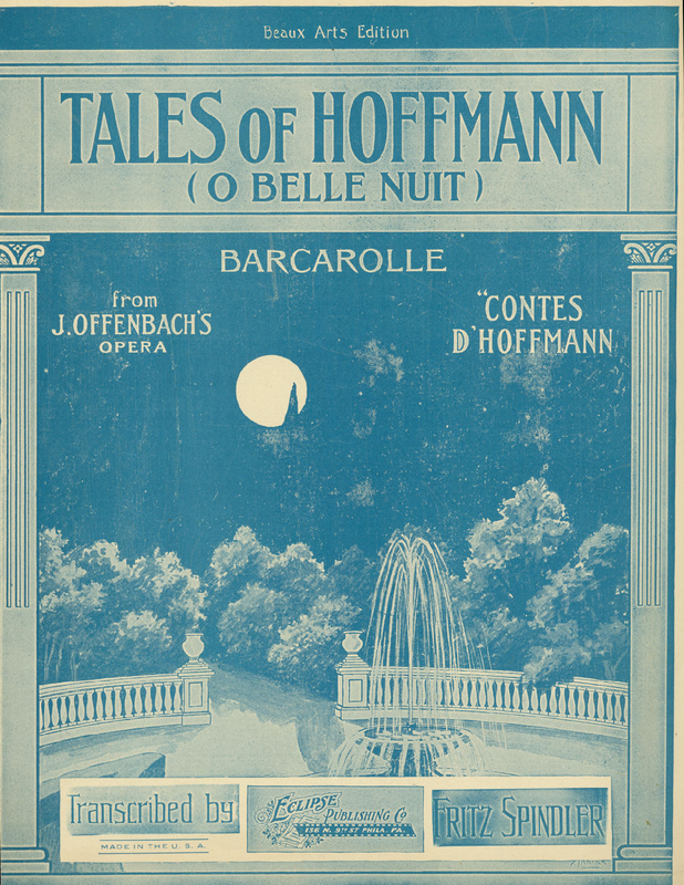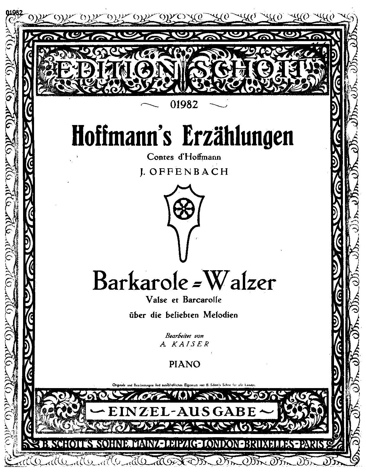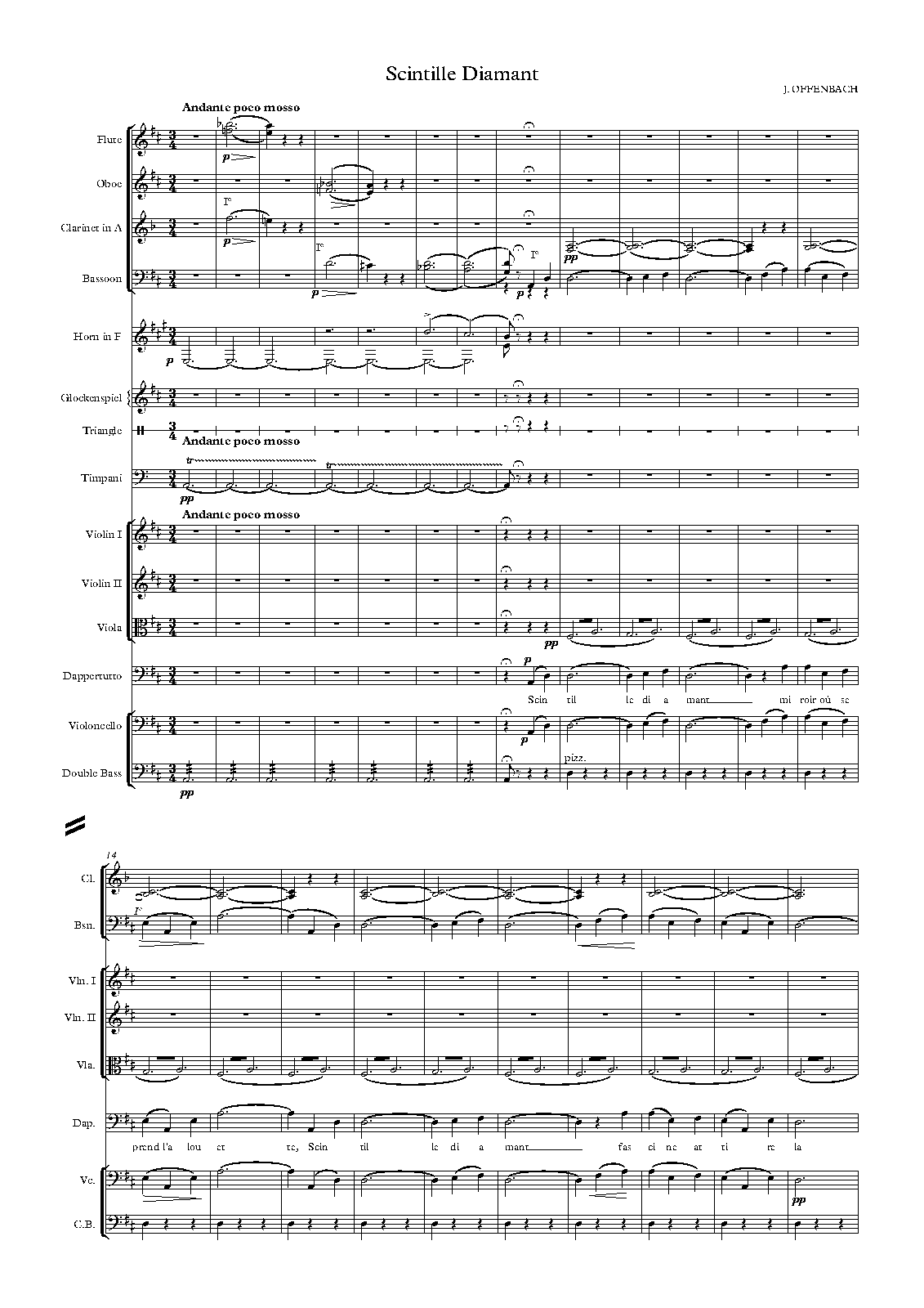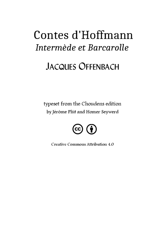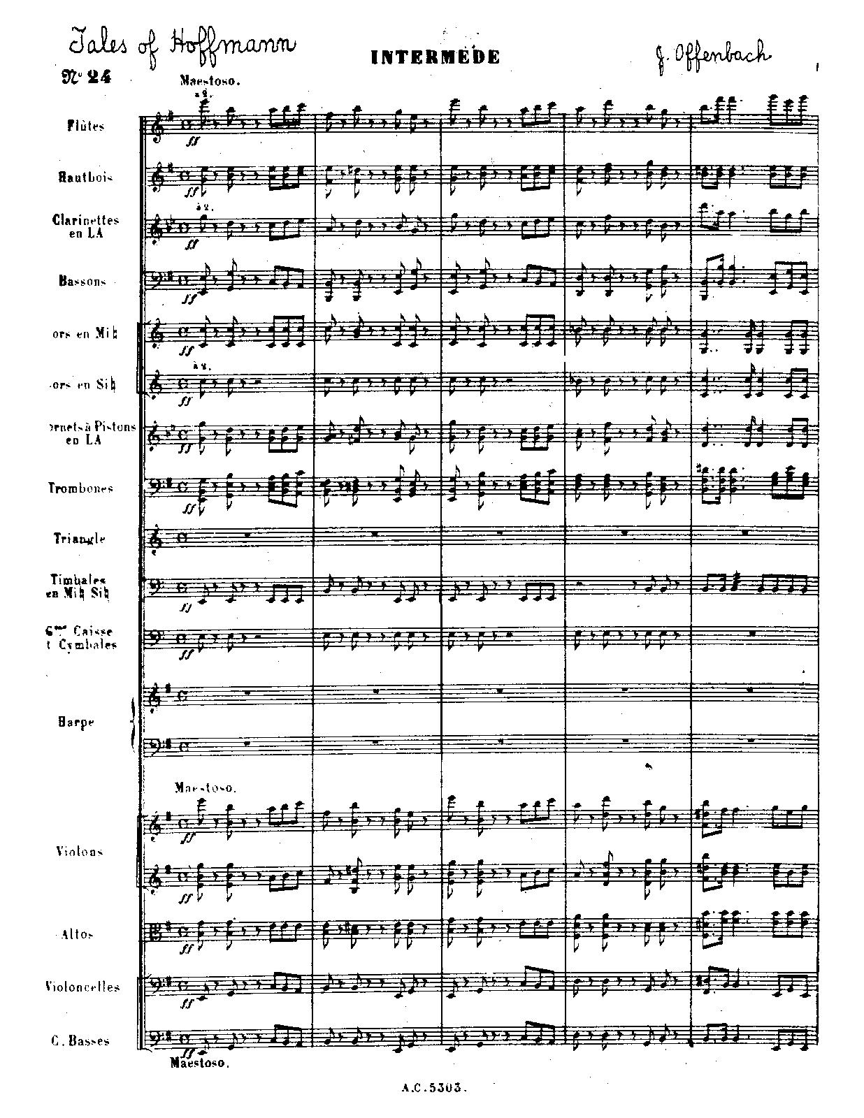 - NOTE: *Originally presented in 4 acts, in a version completed by Ernest Guiraud which omits Act IV and distributes parts of its music to other scenes. The excised content was restored for performances in the early 20th century (published 1907), again constructed in 4 acts (Act V designated Act IV, Scene 2). This version, most common in 20th-century performances, swapped the positions of Act III and Act IV, while restoring recitatives and adding the now-famous chanson 'Scintille diamant' (using music from Le voyage dans la lune) and the septuor (using music of unknown origin with elements of the barcarolle). The section listing above agrees with Offenbach's original intent for the musical order, as does this page's table of contents, yet they do not agree with the majority of scores uploaded here.