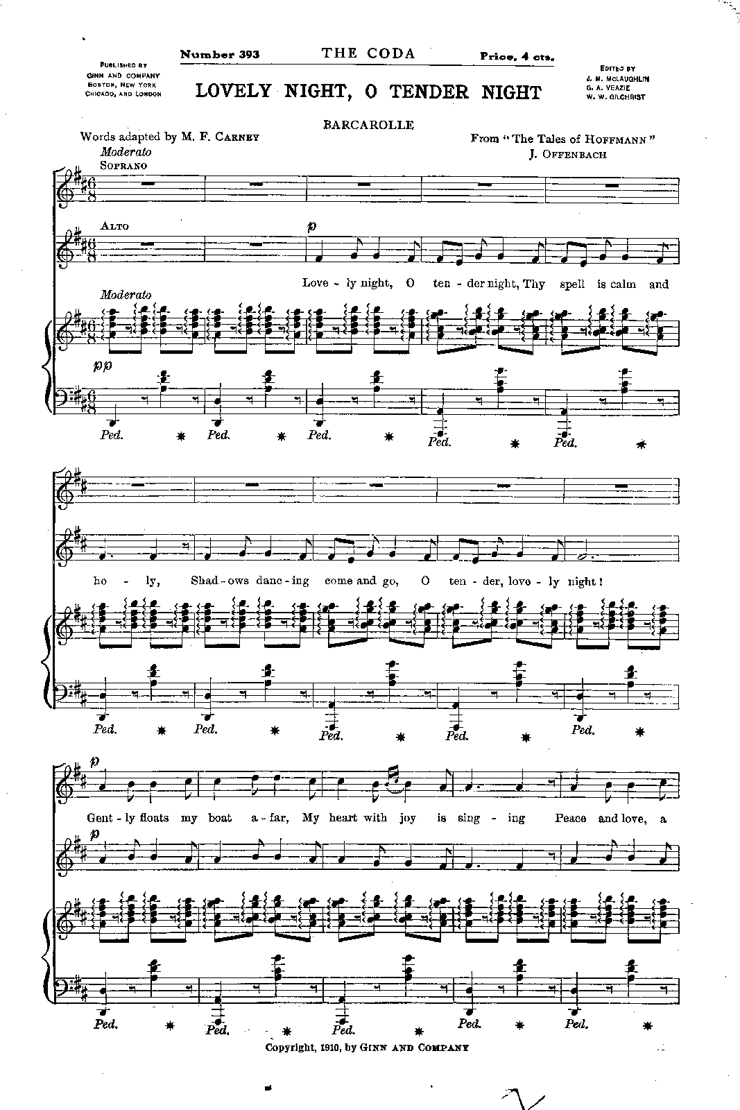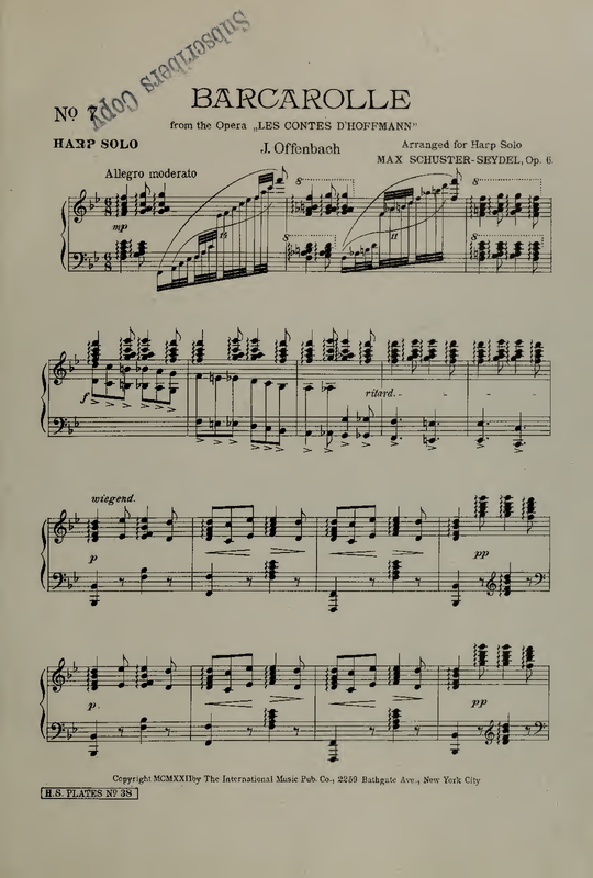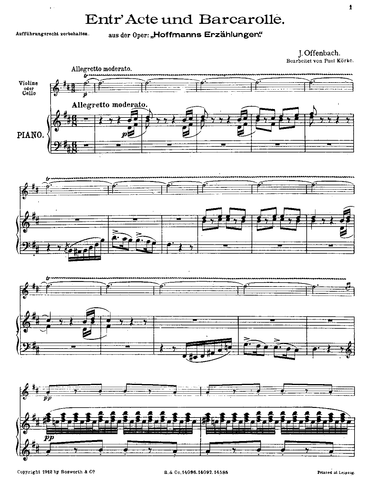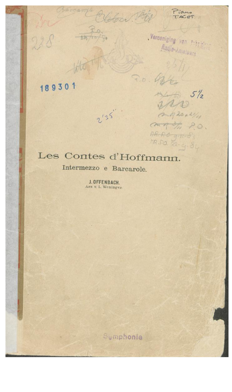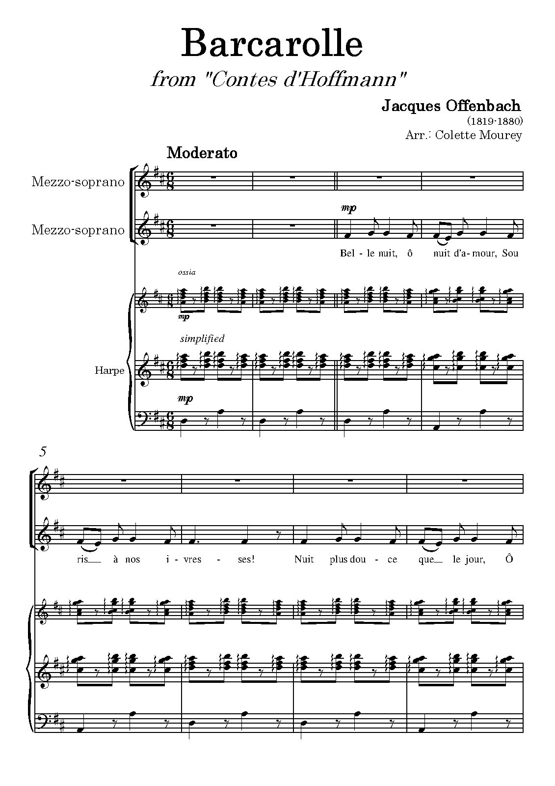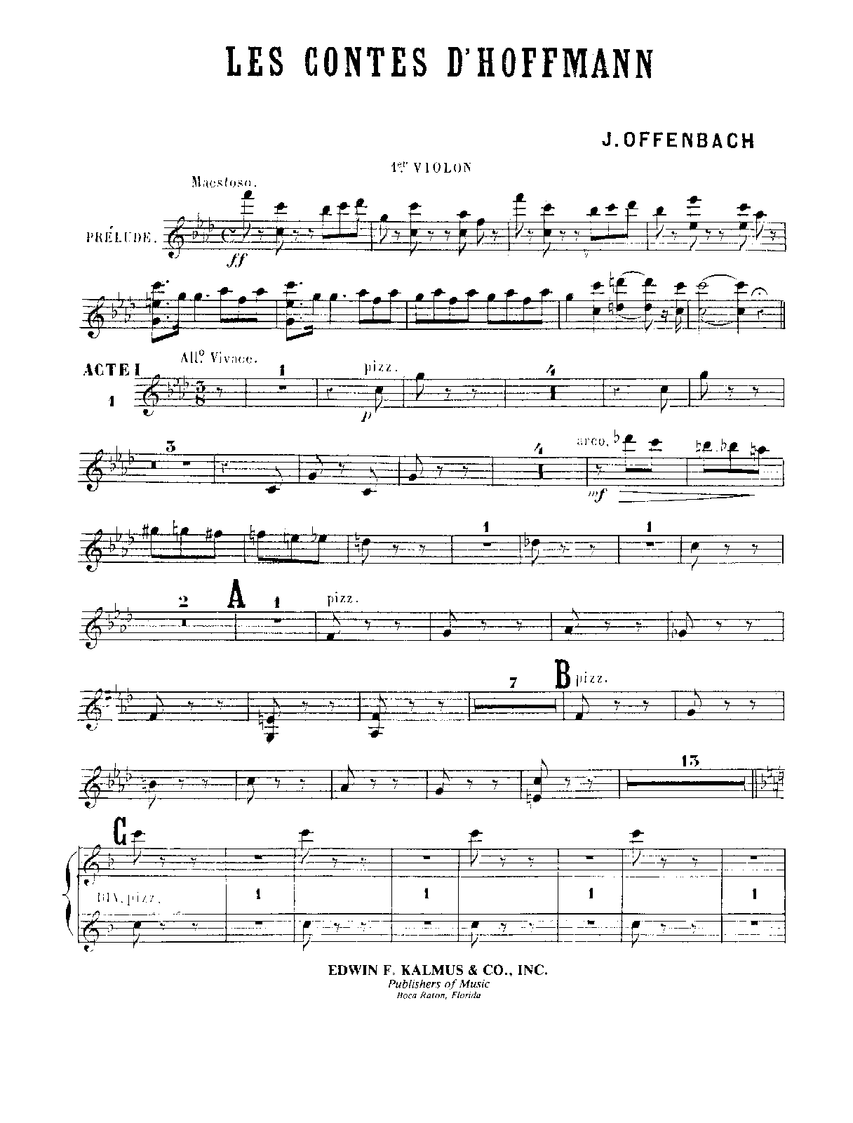- NOTE: *Originally presented in 4 acts, in a version completed by Ernest Guiraud which omits Act IV and distributes parts of its music to other scenes. The excised content was restored for performances in the early 20th century (published 1907), again constructed in 4 acts (Act V designated Act IV, Scene 2). This version, most common in 20th-century performances, swapped the positions of Act III and Act IV, while restoring recitatives and adding the now-famous chanson 'Scintille diamant' (using music from Le voyage dans la lune) and the septuor (using music of unknown origin with elements of the barcarolle). The section listing above agrees with Offenbach's original intent for the musical order, as does this page's table of contents, yet they do not agree with the majority of scores uploaded here.