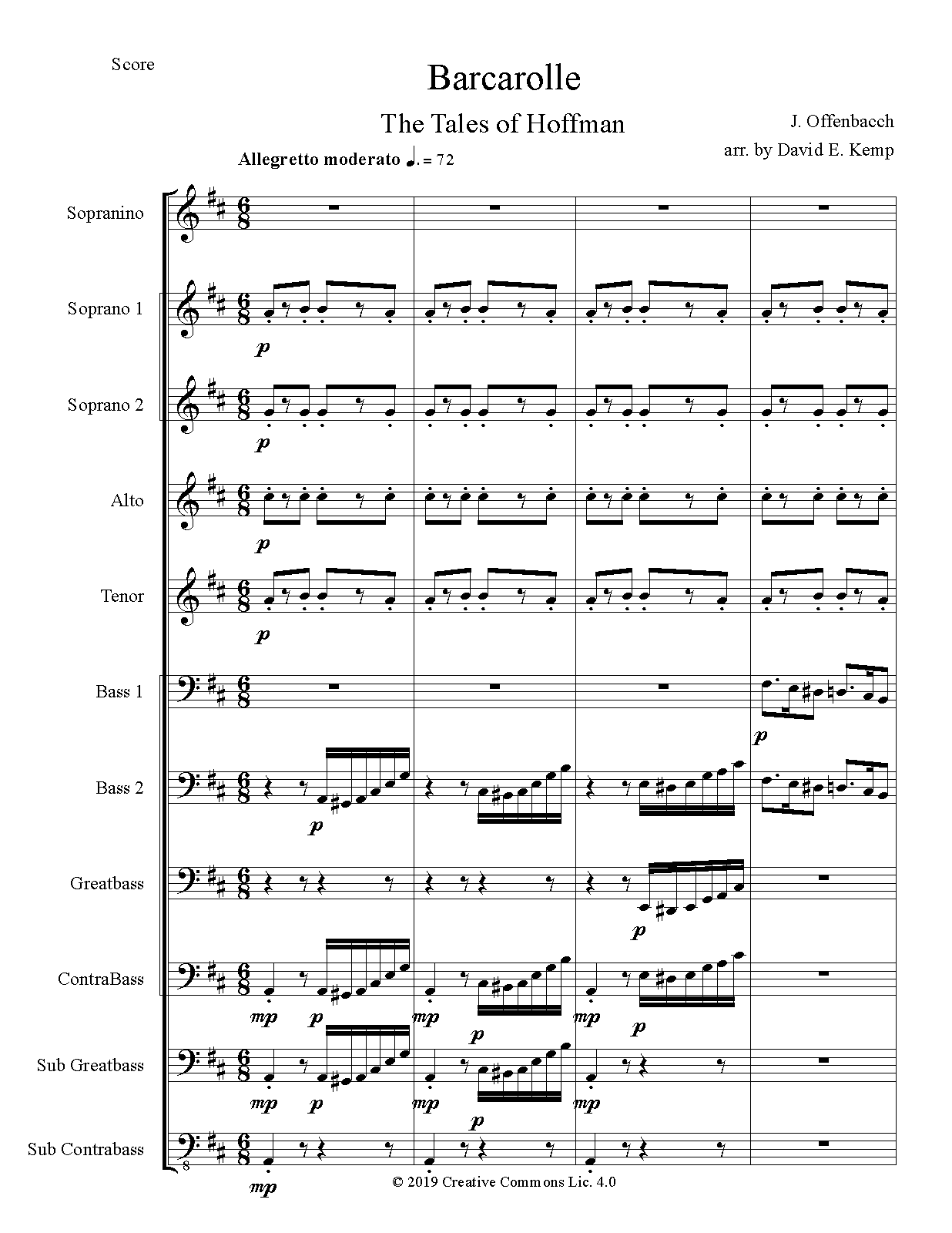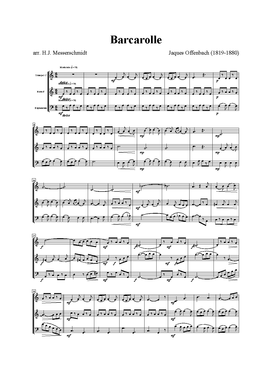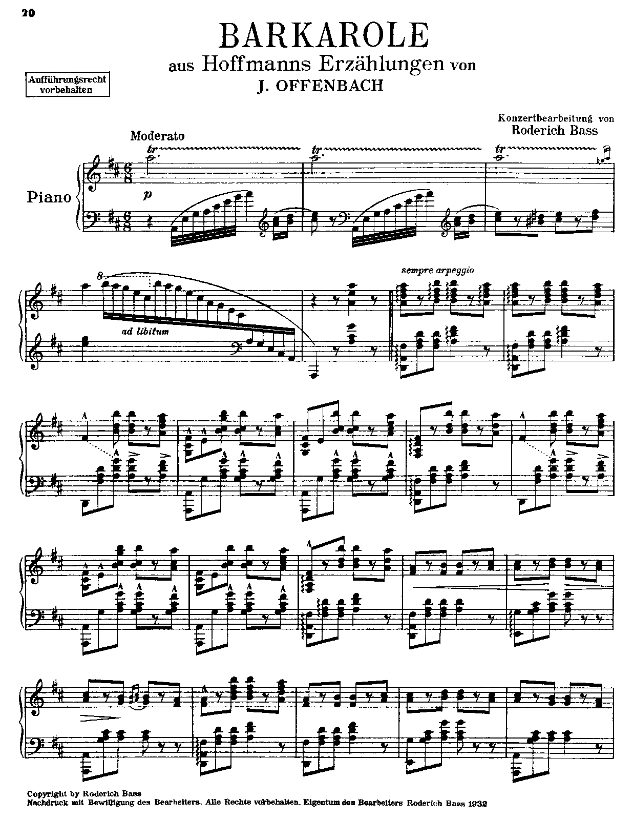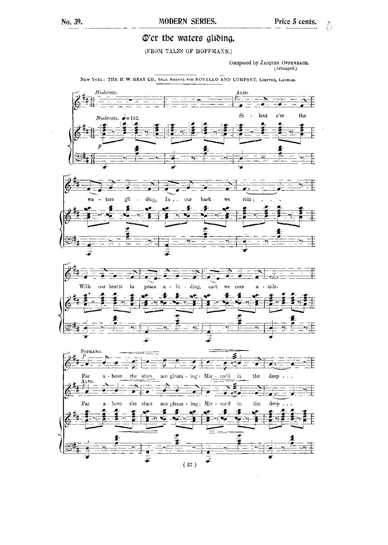 - NOTE: *Originally presented in 4 acts, in a version completed by Ernest Guiraud which omits Act IV and distributes parts of its music to other scenes. The excised content was restored for performances in the early 20th century (published 1907), again constructed in 4 acts (Act V designated Act IV, Scene 2). This version, most common in 20th-century performances, swapped the positions of Act III and Act IV, while restoring recitatives and adding the now-famous chanson 'Scintille diamant' (using music from Le voyage dans la lune) and the septuor (using music of unknown origin with elements of the barcarolle). The section listing above agrees with Offenbach's original intent for the musical order, as does this page's table of contents, yet they do not agree with the majority of scores uploaded here.