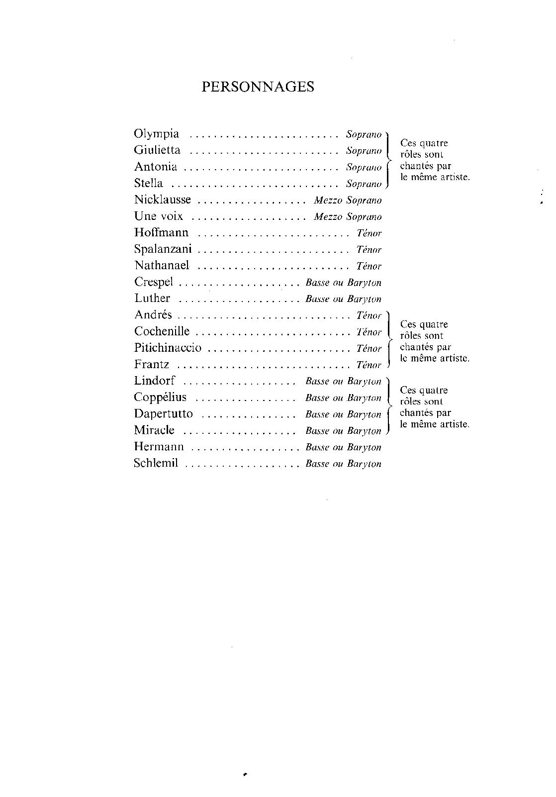 Olympia, poupée mécanique (soprano) Antonia, jeune fille (soprano) Giulietta, courtisane (mezzo-soprano) Stella, cantatrice (soprano) Nicklausse / La Muse (mezzo-soprano) Lindorf (bass-baritone) Coppélius (bass-baritone) Docteur Miracle (bass-baritone) Capitaine Dapertutto (bass-baritone) Andrès, valet de Stella (ténor-bouffe) Cochenille, valet de Spalanzani (ténor-bouffe) Frantz, valet de Crespel (ténor-bouffe) Pitichinaccio, bouffon de Giulietta (ténor-bouffe) Spalanzani, inventeur (ténor-bouffe) Crespel, père d'Antonia (bass) La voix de la tombe (la mère d'Antonia) (mezzo-soprano) Schlémil, amant de Giulietta (baritone) Luther, cabaretier (bass) Nathanaël, étudiant (tenor) Hermann, étudiant (baritone) Wilhelm, étudiant (tenor, rôle coupé après la création)