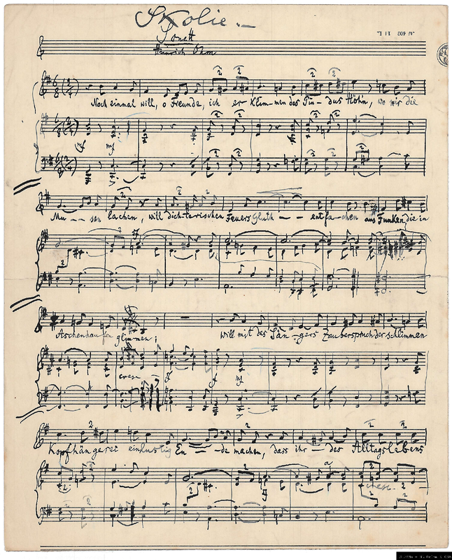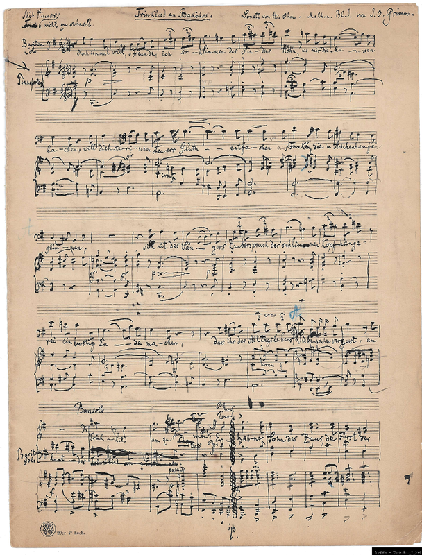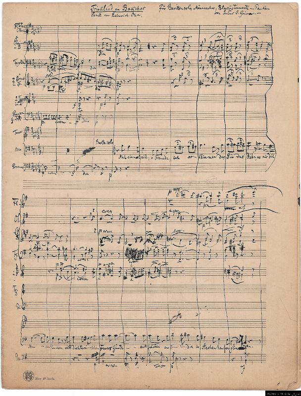 | Alternative. Title | Trinklied an Bakchos fur Bariton solo, Männerchor, Blasinstruments und Pauken; Sonett |