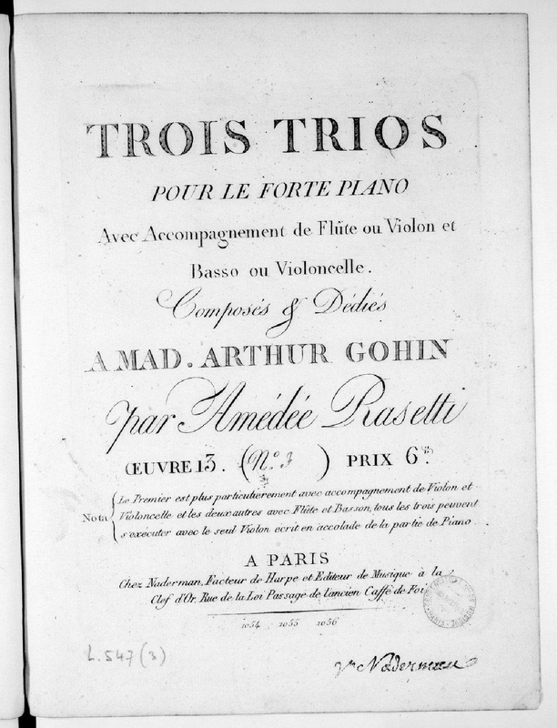 Note: "Le Premier [Op.13 No.1] est plus particulierement avec accompagnement de Violon et Violoncelle et les deux autres [Op.13 No.2 & 3] avec Flute et Basson, tous les trois peuvent s'executer avec le seul violon ecrit en accolade de la partie de Piano"