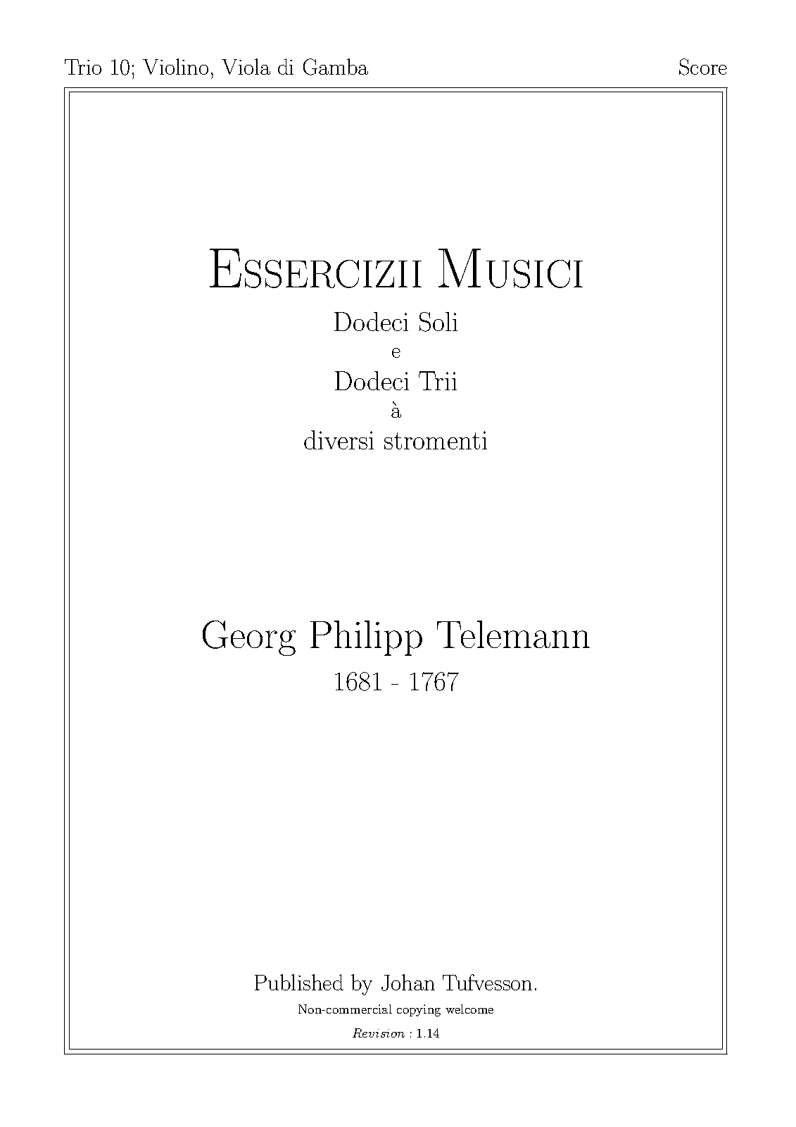 Misc. Notes These file(s) are part of the Werner Icking Music Collection. "Trio 10" in D major of Essercizii Musici. The Gamba part is in alto clef; if played on viola, only one note is too low.