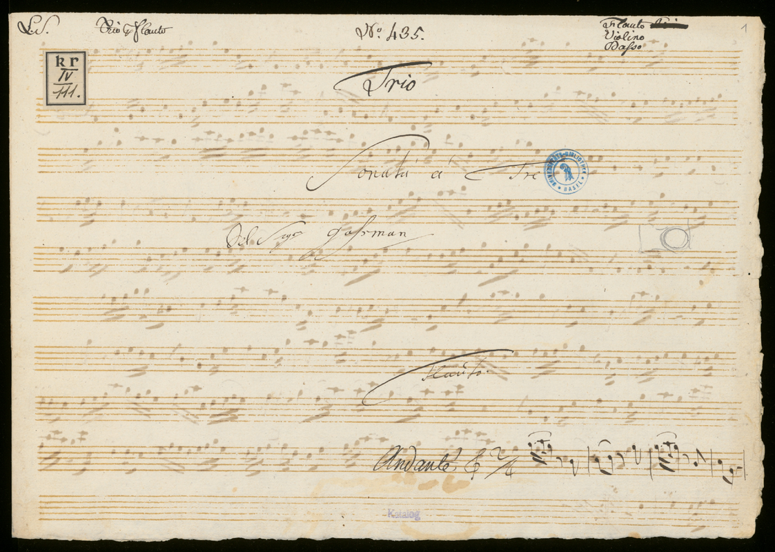 | Genre Categories | Sonatas; For flute, violin, cello; Scores featuring the flute; |