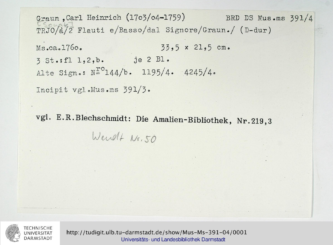 | Opus/Catalogue NumberOp./Cat. No. | GraunWV B:XV:57 ; WenG 50 |