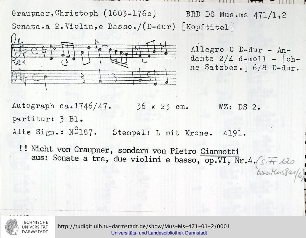 | Opus/Catalogue NumberOp./Cat. No. | Op.6 No.4 ; GWV 916 |