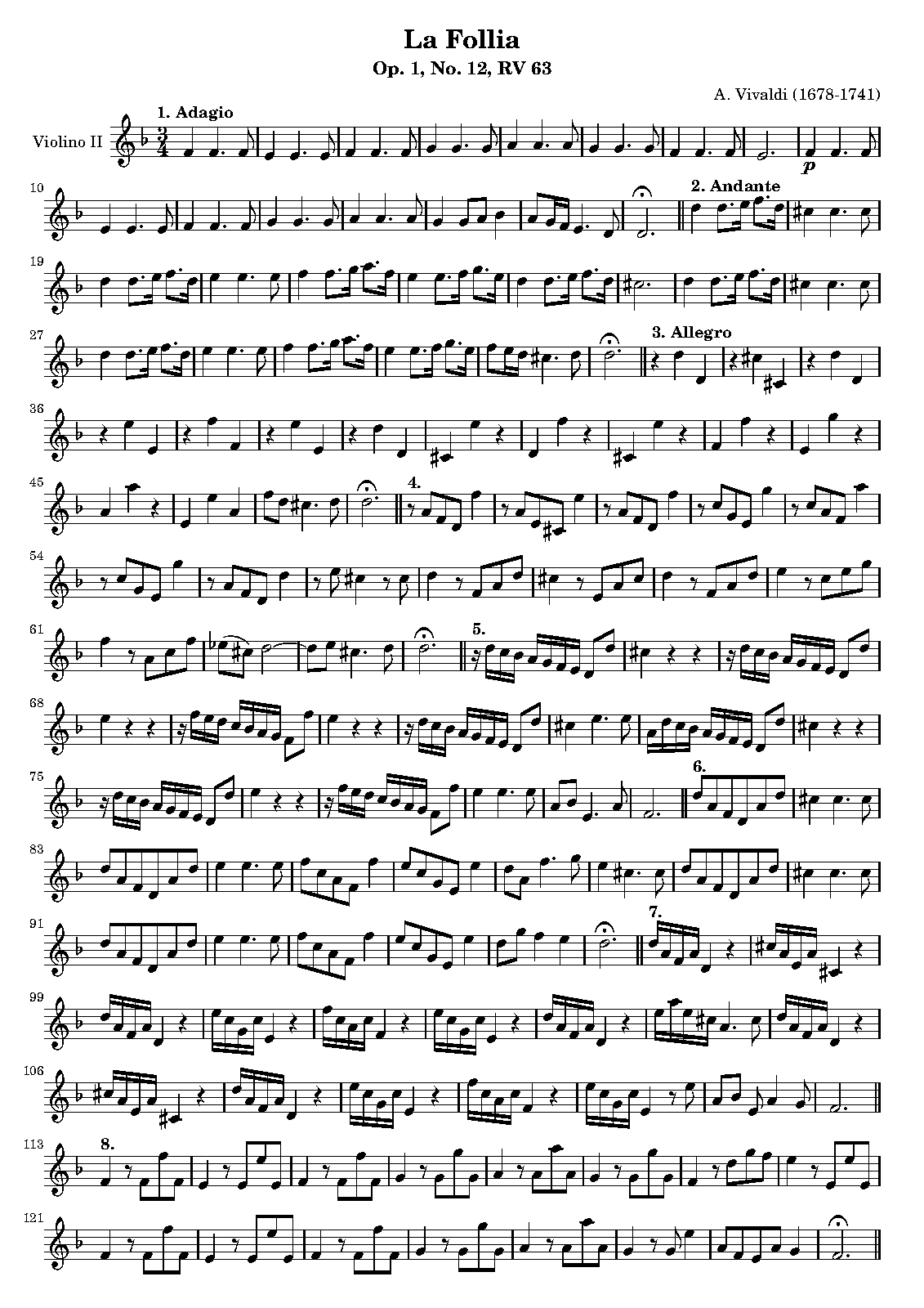 Name Aliases La Follia; Follia; Sonata (Variotionen) d-moll; Sonata n. 12 in d-minor La Follia (RV 63); Folia variations; La Folia variations; Vivaldi, Antonio, 1678-1741. Trio sonatas, violins (2), continuo, op. 1. No. 12