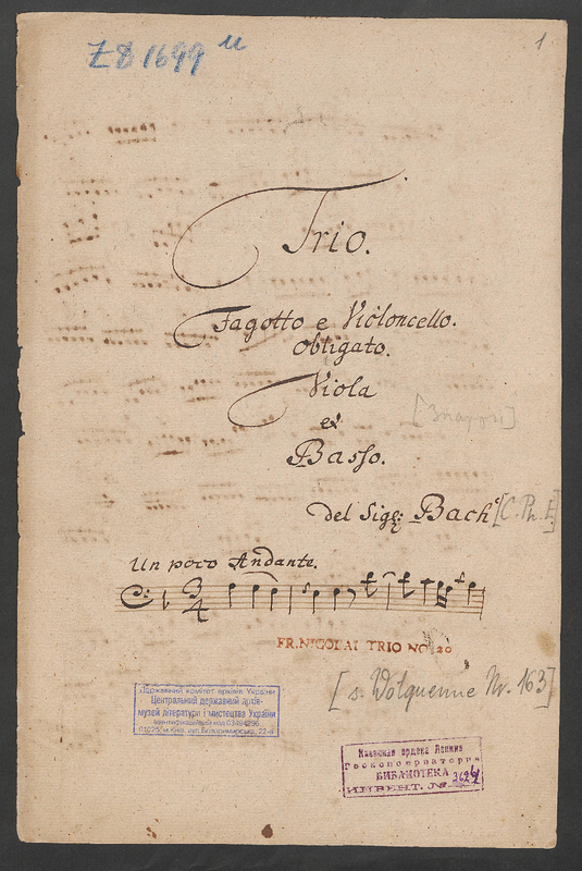 The Archive of the Sing-Akademie zu Berlin (D-Bsa): SA 3624 This file is based on high-resolution images obtained from the source using a method explained on this page. The Bassoon part is labelled "Fagotto e[o?] Violoncello".