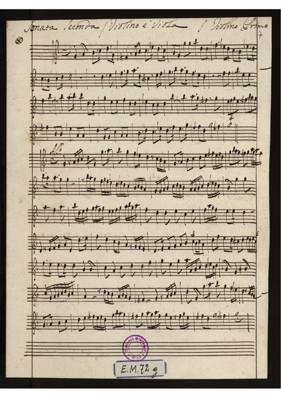 The two sets of manuscript parts above are both given the same shelf mark in ÖNB (EM.72.g). The second set of parts contains a part for 'viola' which is notated in bass clef and is too low for viola. The ÖNB website (which digitised the manuscript) identifies it as a part for violoncello. RISM identifies it as a part for viola da gamba.