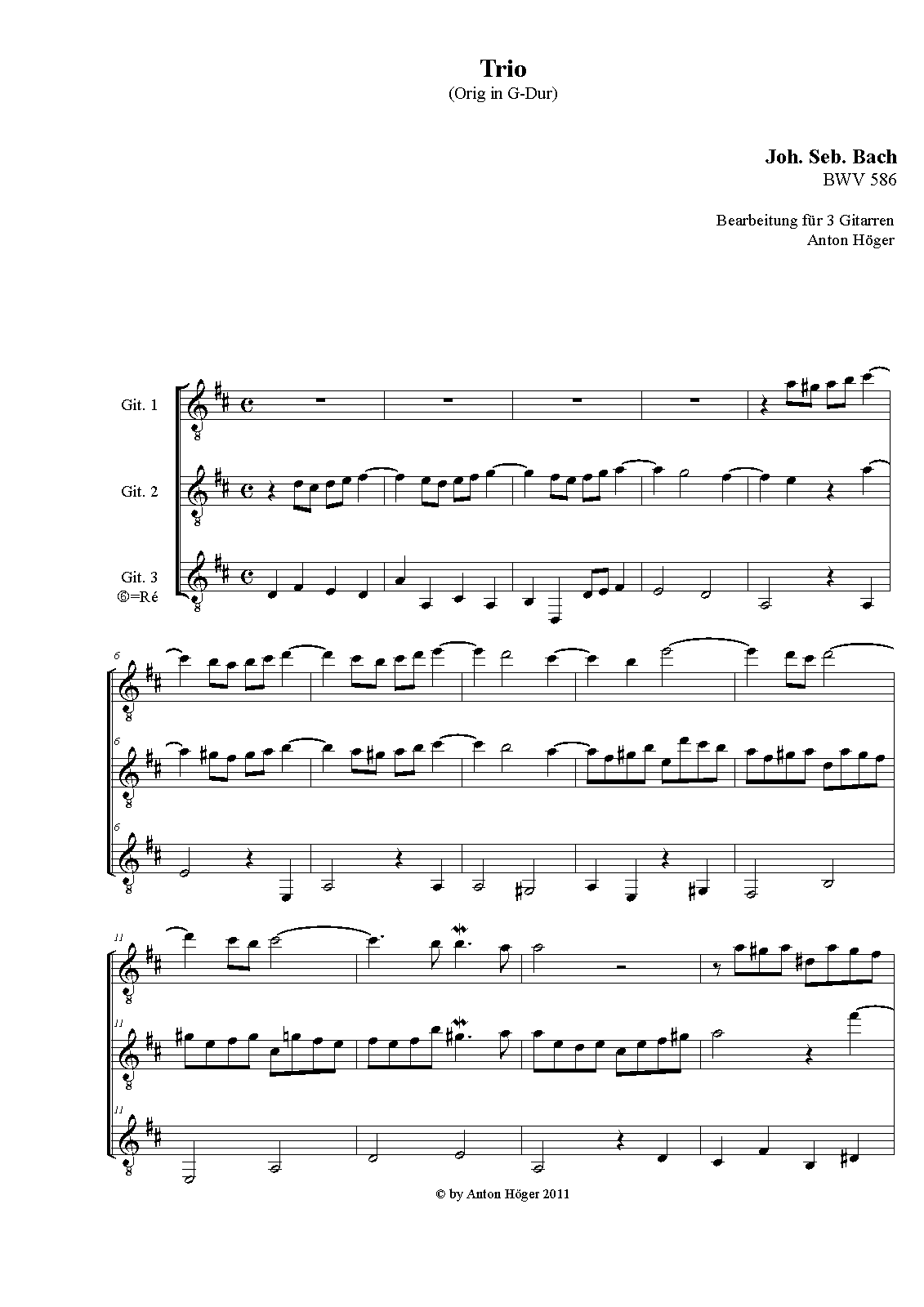 Extra Information *Attribution doubtful. "Die einzige handschriftliche Quelle zu diesem Trio stammt aus der Feder eines Kopisten von Johann Nikolaus Mempell." W. Schmieder, BWV (1990 ed., p.543).
