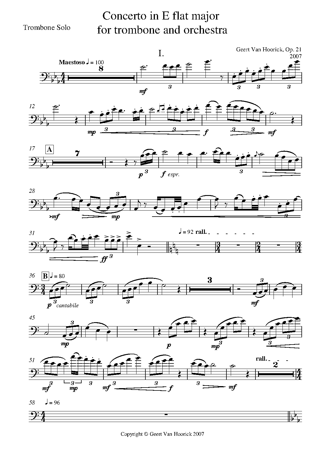 | Extra Information | This is a modern-classical (i.e. neoclassical, not really modern) trombone concerto. It was composed in 2007 and revised in 2015 and 2024. The 1st movement is moderately fast, solemn and epic, and in sonata form. The 2nd movement is slow, solemn and moving, and in Lied form (ABA). The final movement is fast, joyous and heroic, and in rondo form. There is a cadenza in the final movement. You hear a digital performance using Sibelius 6 and Garritan Personal Orchestra. A score moving video is on my YouTube channel. The parts are not yet updated to the new version of the score. |