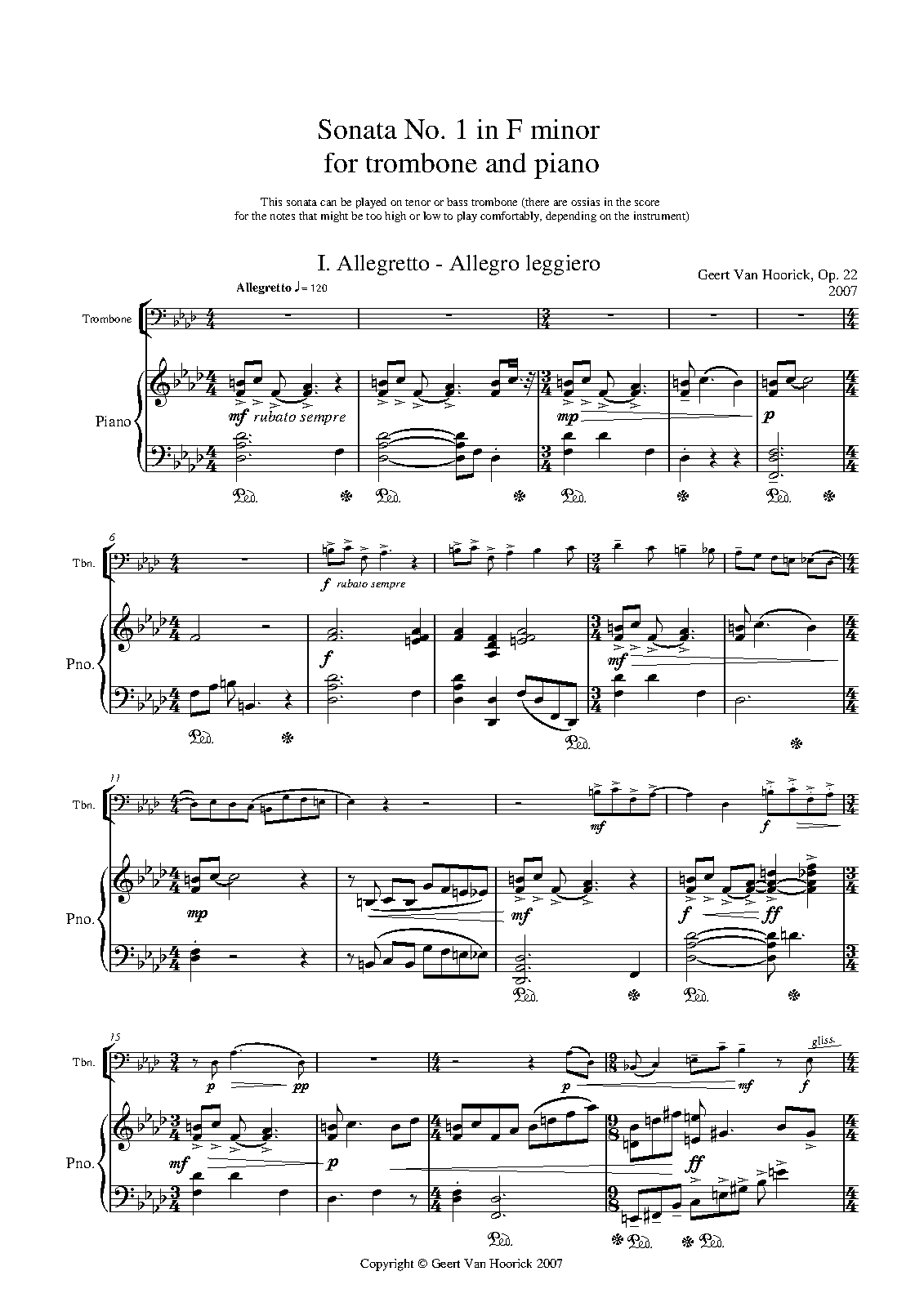 The 1st trombone sonata is modern-classical (quite modern) and suited for bass or tenor trombone (there are some ossias). It consists of three movements. The 1st one is fast, and light and bright, after a more dark introduction. The 2nd one is a singing slow movement. The 3rd one is a very fast, catchy perpetuum mobile. Digital performance made in Sibelius 5 with Garritan Personal Orchestra. Videos with the scrolling score and play along videos (with just the accompaniment) are on my YouTube-channel.