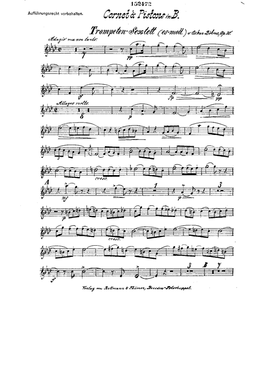| Alternative. Title | Trompeten-Sextett, Es moll, für Cornet à pistons in B, 2 Trompeten in B, Basstrompete in Es (Althorn), Trombone (Tenorhorn) und Tuba (Bariton) |