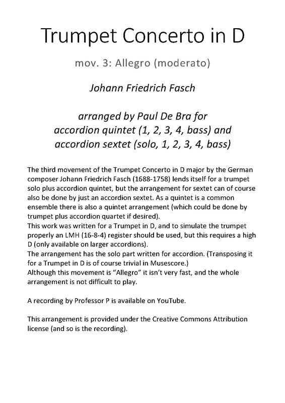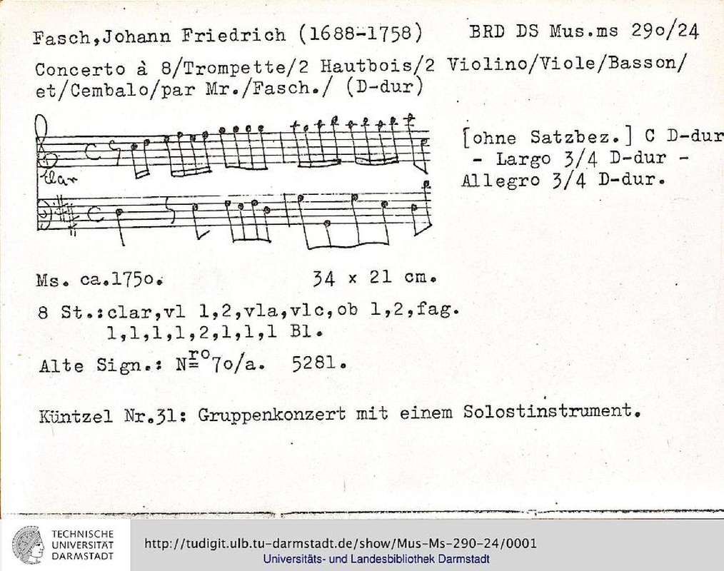 | Extra Information | First? published in 1964 by Sikorski-Verlag. I gather this is the same concerto. Catalog listings in other libraries have this Sikorski edition under FaWV L:D1, arr.) The first movement has no tempo indication in the manuscript parts. |