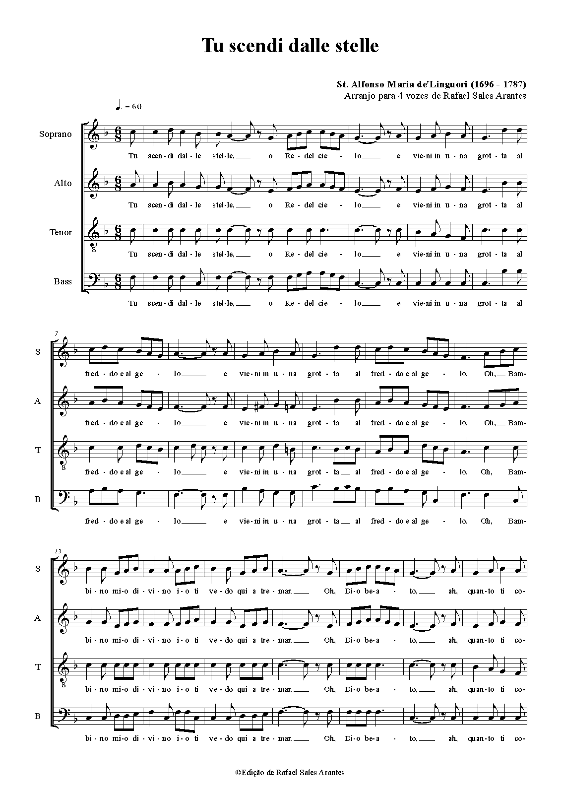 The RISM entry for this lists it as anonymous, but under "Title on Source", says "Novena, e Natività del N. S. G. C. / Del B:o Alfonso Maria / de Liguori Vescovo di S: Agata de / R Gesù Bambino", which indicates Liguori. However, the music there does not really match the incipit of Arantes' arrangement, and the original instrumentation has been taken from the RISM page. Tagging is therefore subject to correction.