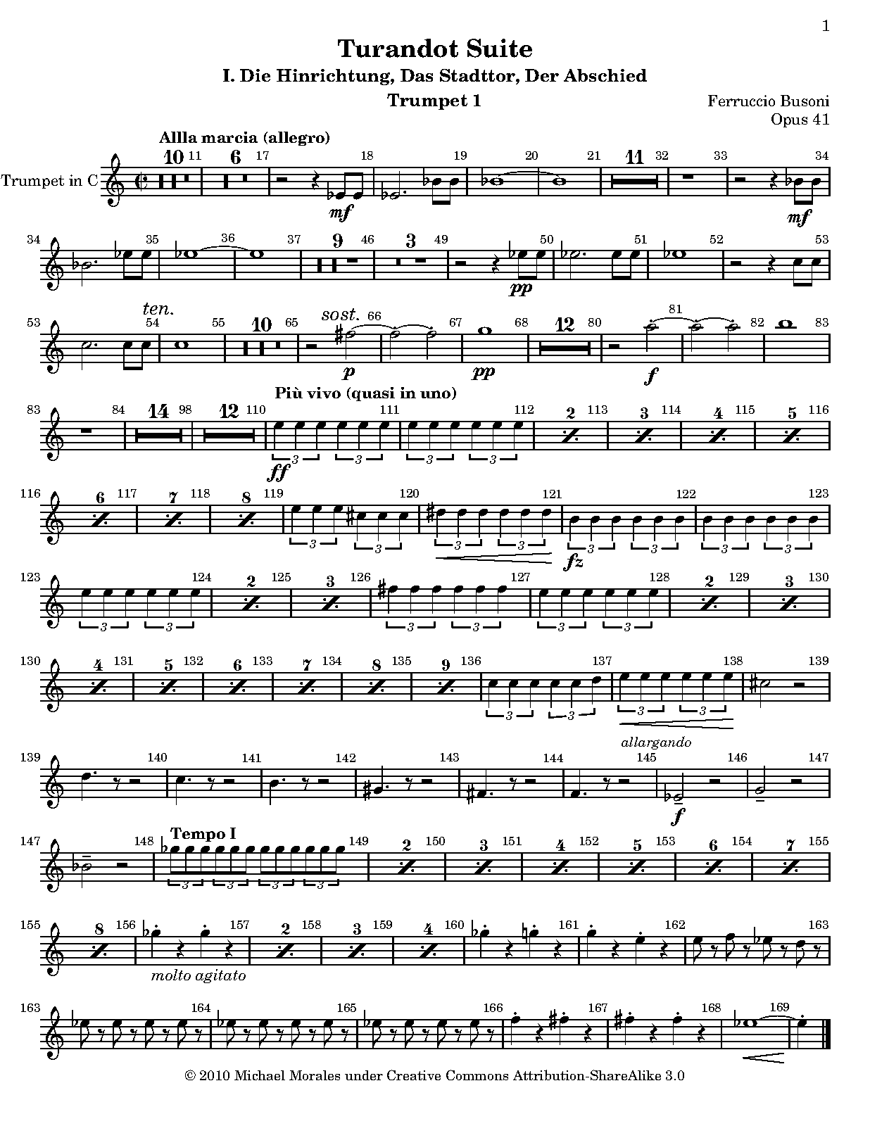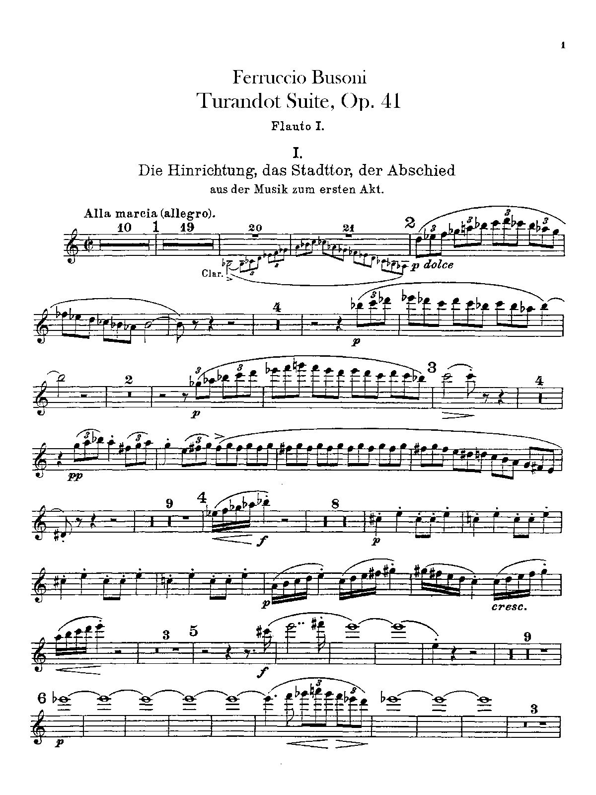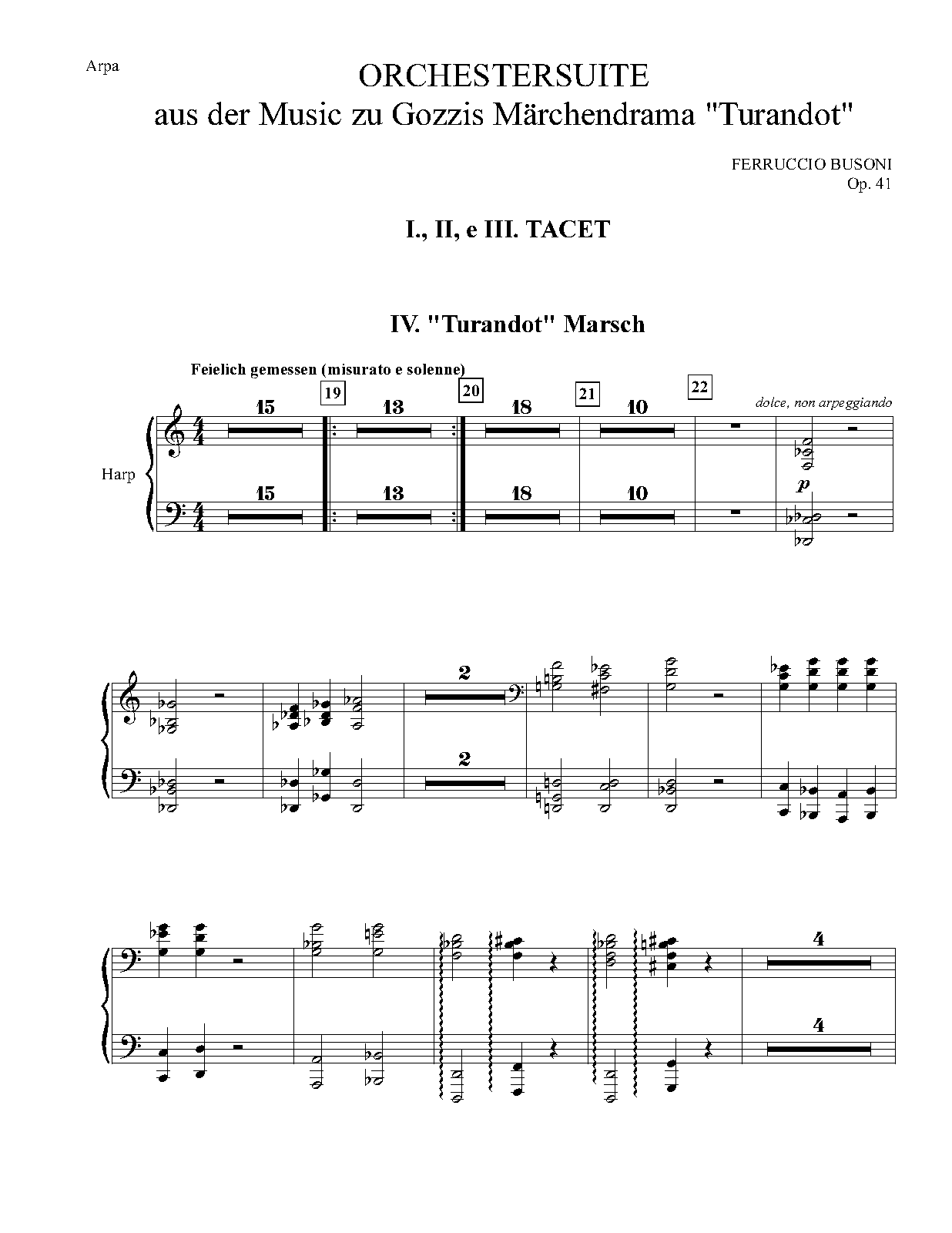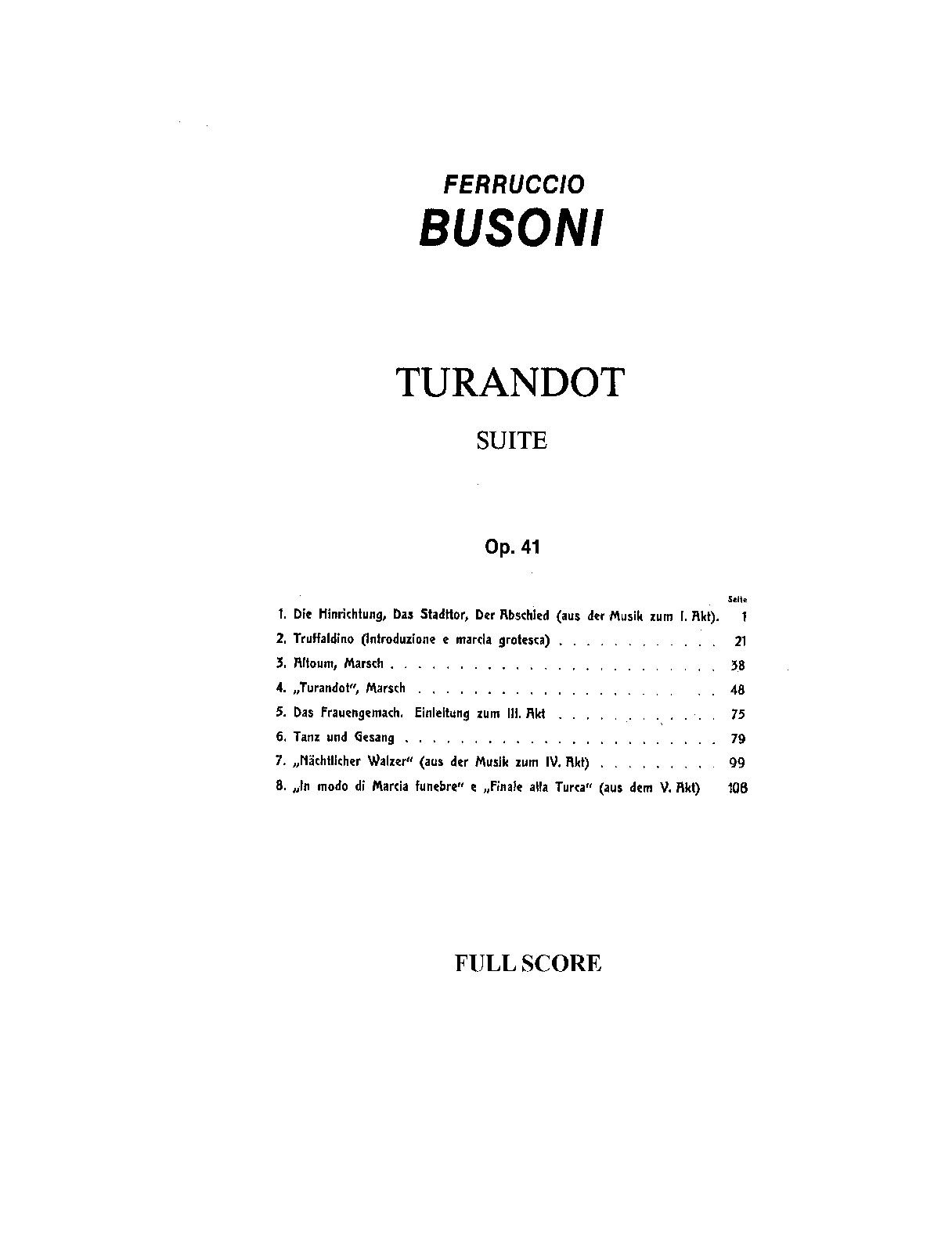 ⇒ 8 more: I. Die Hinrichtung, Das Stadttor, Der Abschied • II. Truffaldino (Introduzione e marcia grotesca) • III. Altoum Marsch • IV. "Turandot" Marsch • V. Das Frauengemach • VI. Tanz und Gesang • VII. "Nächtlicher Walzer" • VIII. "In modo di Marcia funebre" e "Finale alla Turca"