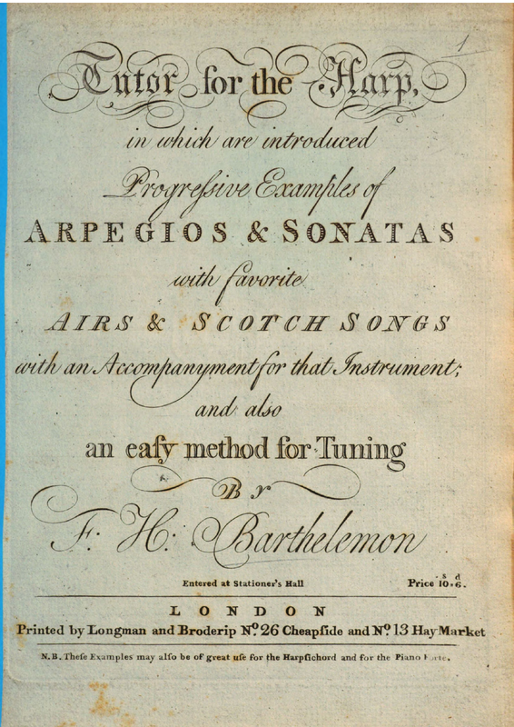 Alternative. Title Tutor for the Harp, in which are introduced Progressive Examples of Arpegios [sic] & Sonatas with favorite Airs & Scotch Songs with an Accompanyment for that Instrument, and also an easy method for Tuning by F. H. Barthelemon ... N.B. These Examples may also be of great use for the Harpsichord and for the Piano Forte.