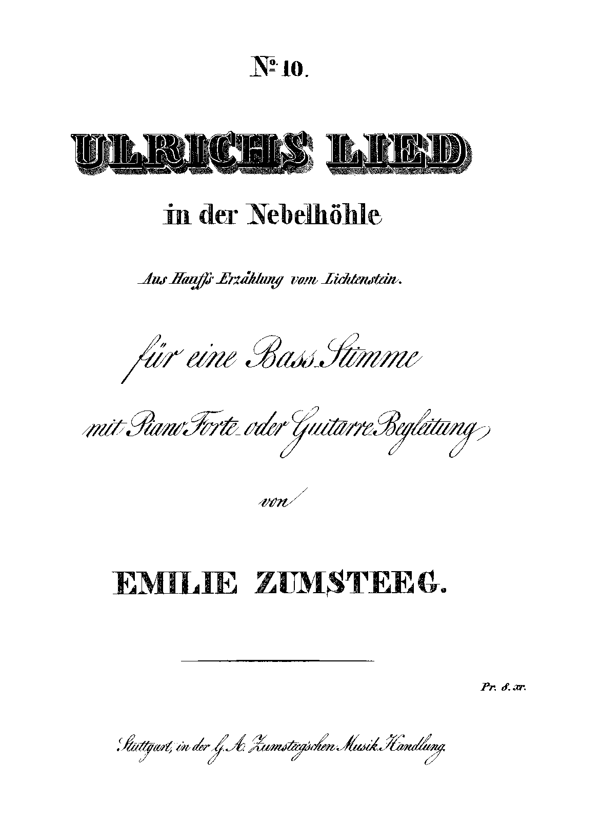 | Alternative. Title | Ulrichs Lied; Ulrichs Lied in der Nebelhöhle aus Hauffs Erzählung vom Lichtenstein für eine Bass Stimme mit Piano Forte oder Guitarre Begleitung |