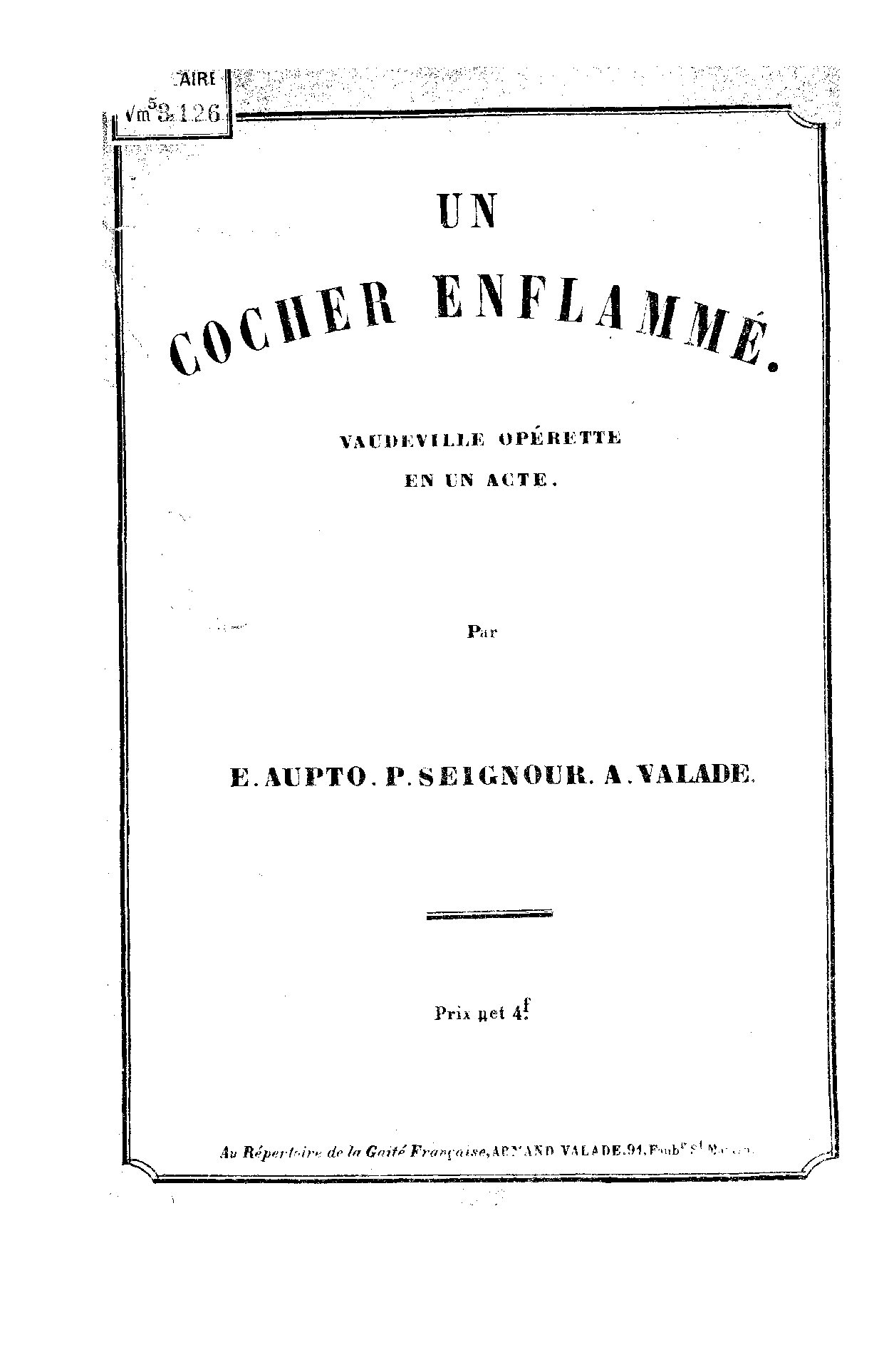 | Alternative. Title | Vaudeville-opérette en un acte |