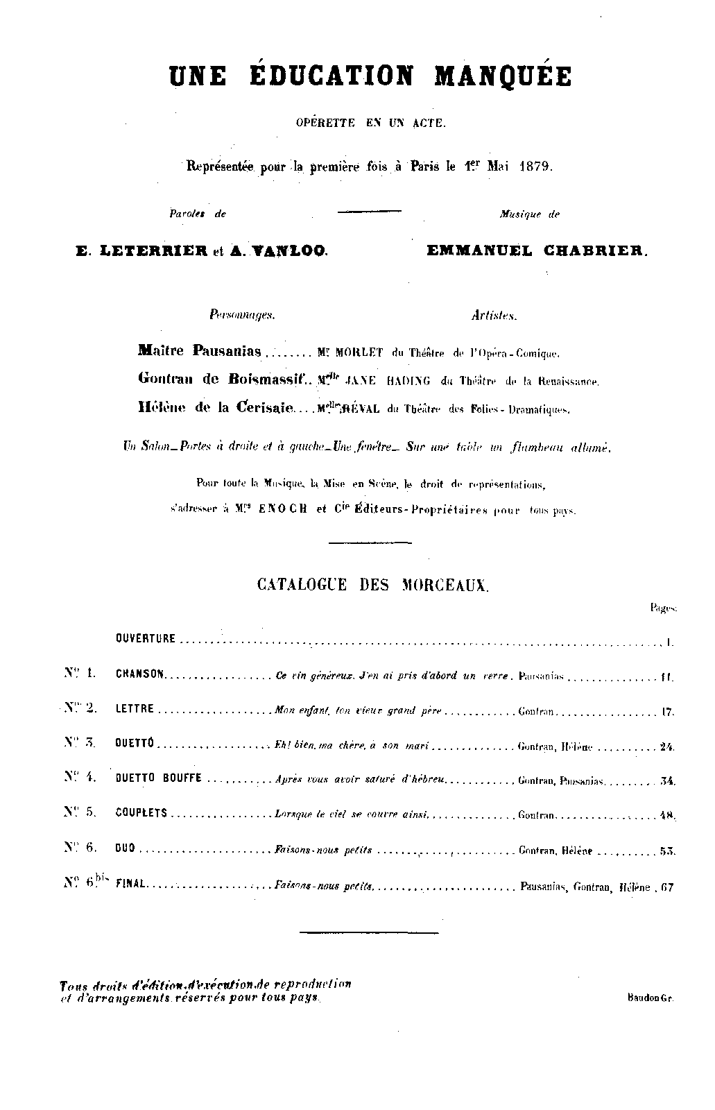 | Librettist | Eugène Letterier (1843-1884) Albert Vanloo (1846-1920) |