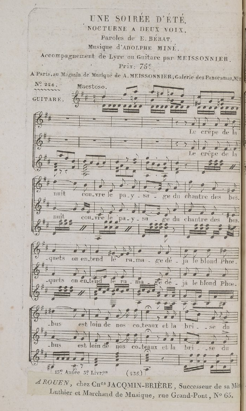 From: Journal de Lyre ou Guitare, Rédigé par Meissonnier. Nocturne à 2 voix, paroles de E. Bérat, musique d'A. Miné, avec accompagnement de lyre ou guitare par A. Meissonnier. N° 224, 13e Année, 3e Liv.