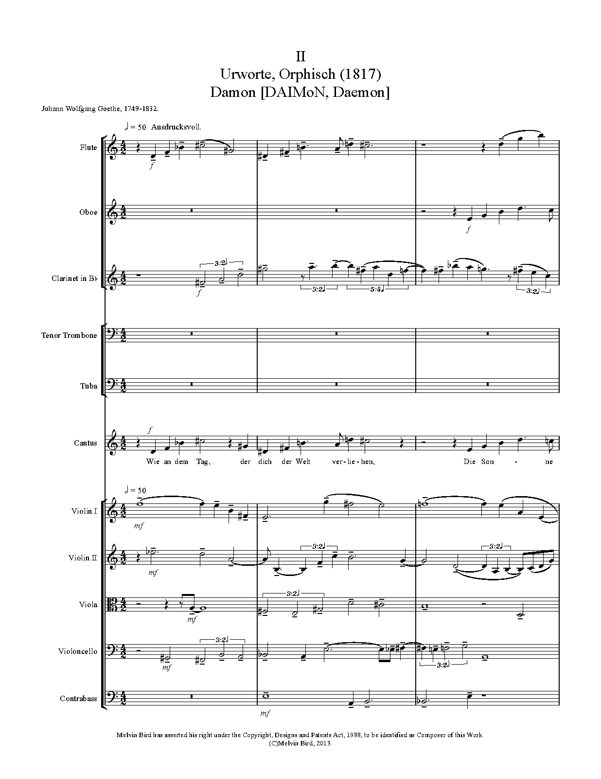 cantus, flute, oboe, clarinet (B♭), tenor trombone, tuba, 2 violins, viola, cello, double bass