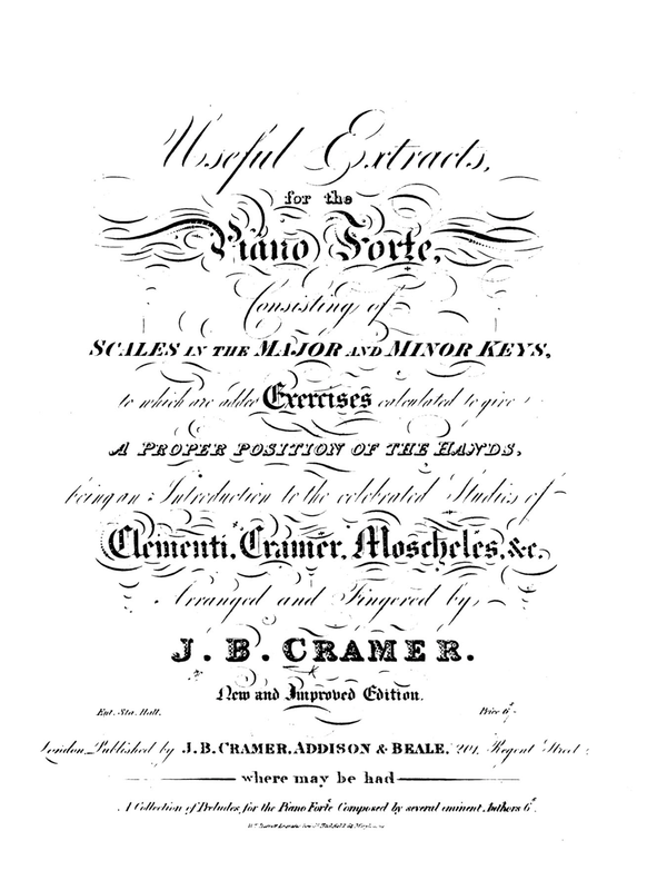 | Alternative. Title | Useful Extracts for the Piano Forte, consisting of Scales in the Major and Minor Keys, to which are added Exercises calculated to give a proper position of the hands, being an Introduction to the celebrated Studies of Clementi, Cramer, Moscheles, &c. Arranged and Fingered by J. B. Cramer |